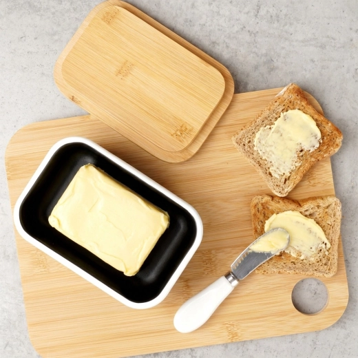 Naturalna bambusowa pokrywka pomaga utrzymać masło chronione i dłużej świeże – idealna do lodówki i na stół.