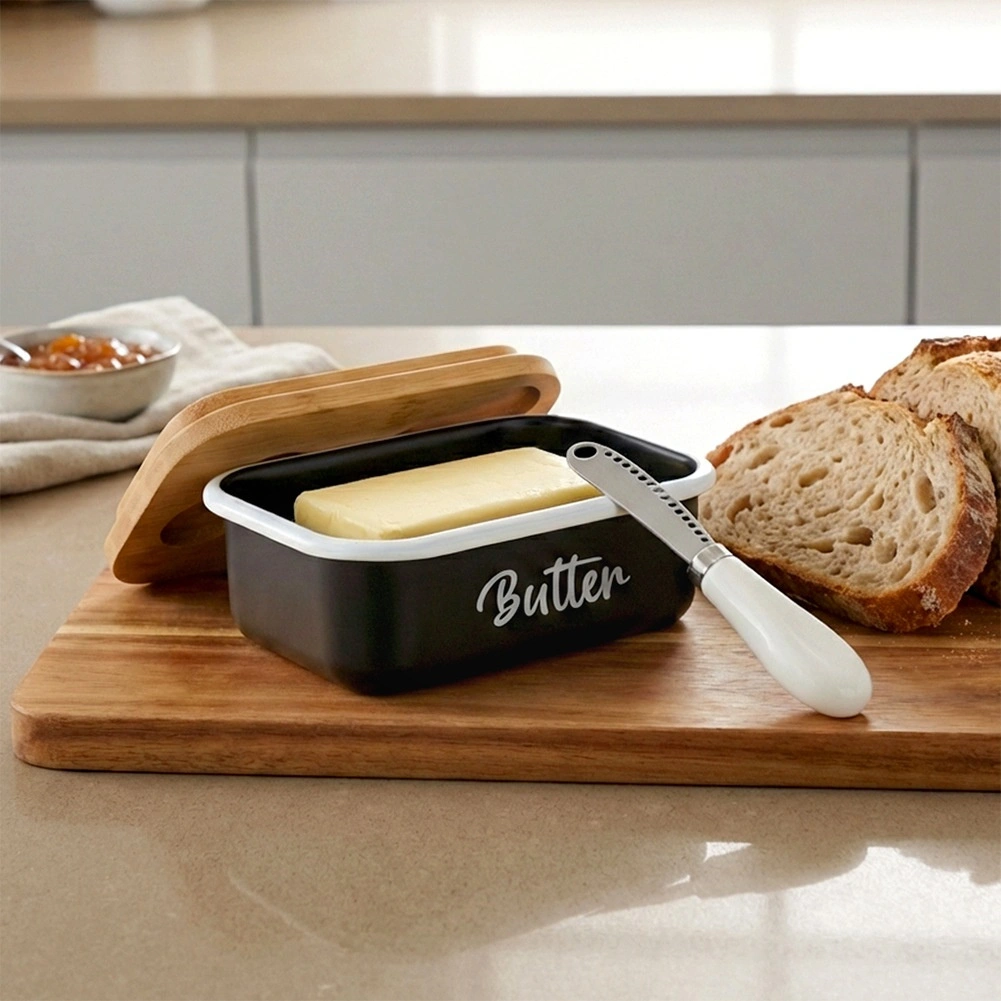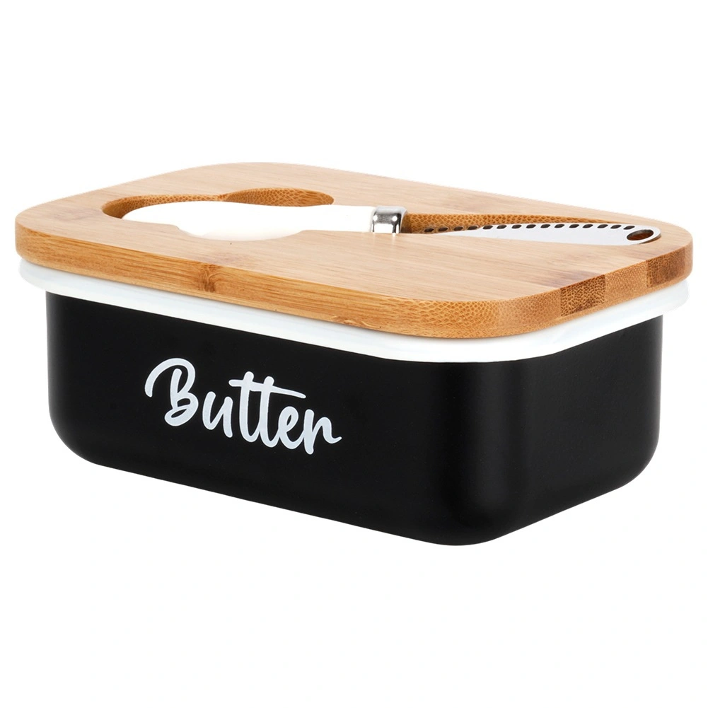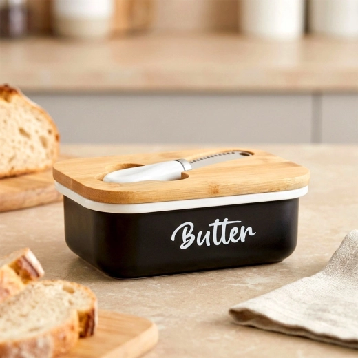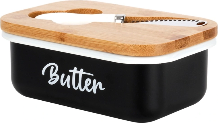 Stylowa maselniczka do codziennego użytku utrzyma Twoje masło długo świeże i gotowe do podania. Ma czarne metalowe korpus z napisem Butter, bambusową pokrywkę oraz praktyczny nożyk ze stali nierdzewnej umieszczony bezpośrednio w pokrywce. Łatwa w czyszczeniu, a dzięki ponadczasowemu wzornictwu pasuje do każdej kuchni.