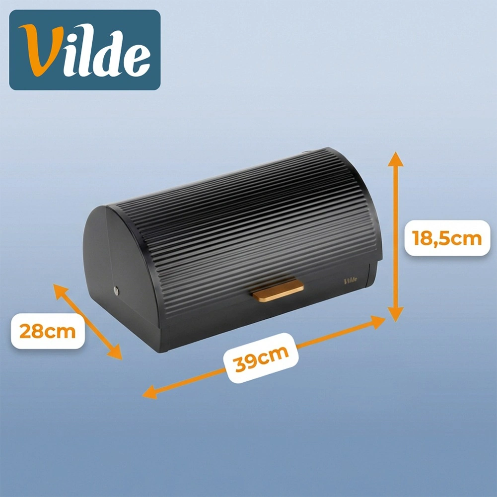 Praktyczny i pojemny chlebak o wymiarach 39 × 28 × 18,5 cm oferuje bezpieczne miejsce na chleb, bułki i słodkie wypieki. Solidna metalowa konstrukcja z powłoką proszkową w matowej czerni jest odporna na uszkodzenia i pomaga utrzymać idealne warunki przechowywania.
