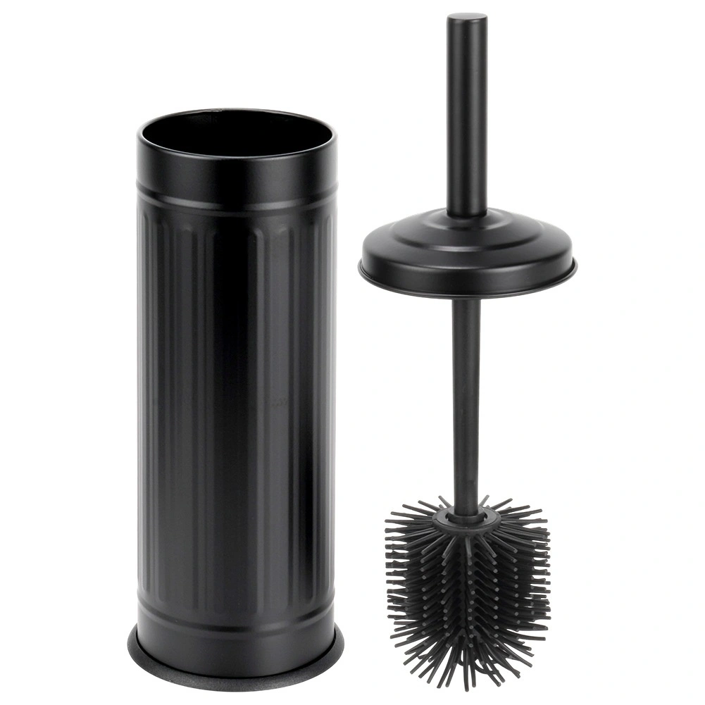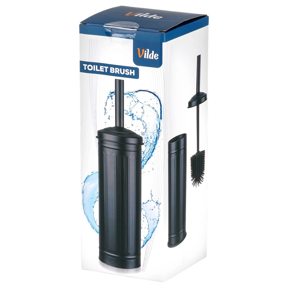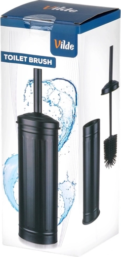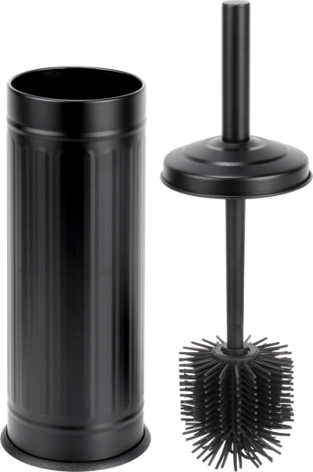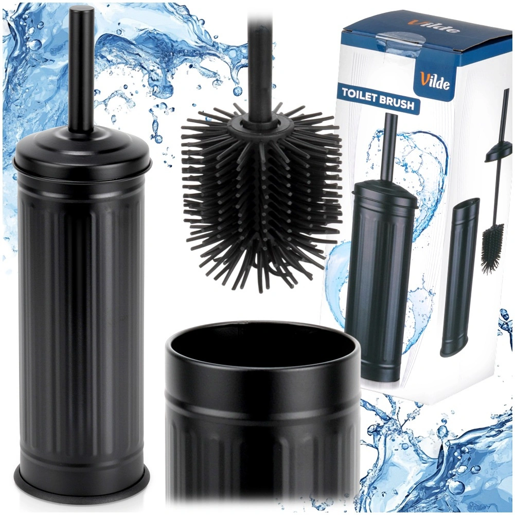 Elegancka i higieniczna szczotka WC ze stojakiem w czarnym kolorze do nowoczesnych łazienek. Wytrzymała konstrukcja, silikonowe włosie dla łatwego czyszczenia, zamknięty metalowy stojak z ociekaczem oraz wymienna głowica czyszcząca dla długiej żywotności.