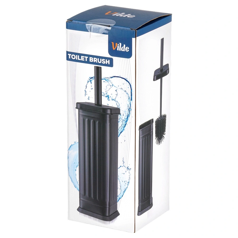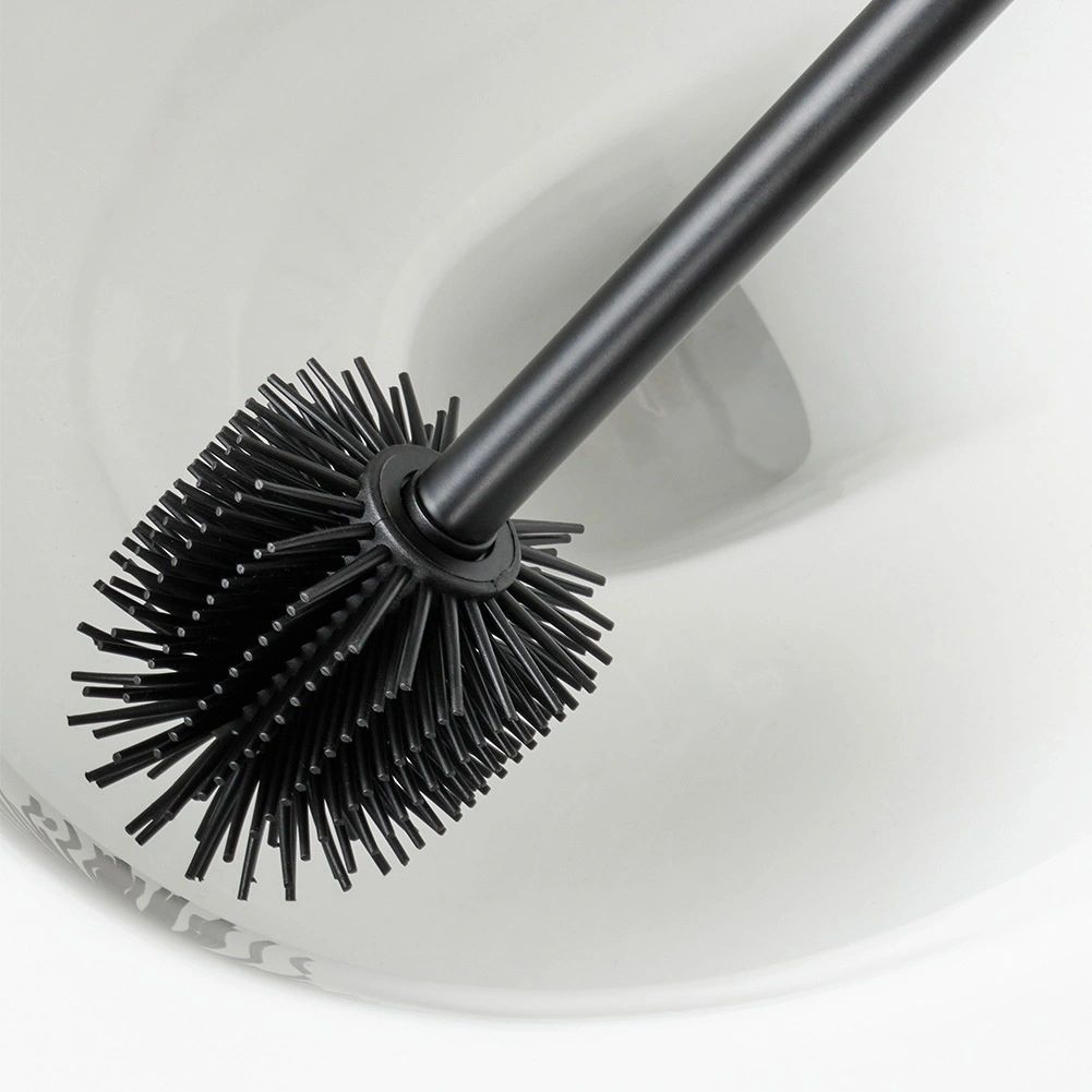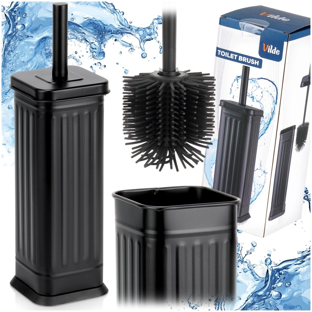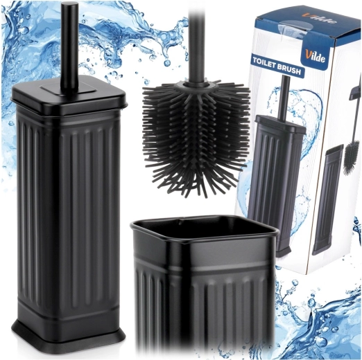 Elegancka i higieniczna silikonowa szczotka do WC z metalowym, zamkniętym stojakiem w czarnym kolorze dla czystej i zadbanej łazienki. Elastyczne silikonowe włosie do dokładnego czyszczenia, wygodny uchwyt oraz wyjmowana wkładka dla łatwej pielęgnacji. Stylowy design pasujący do każdego wnętrza.