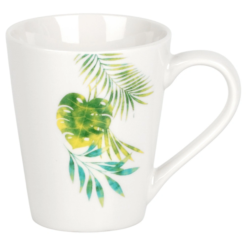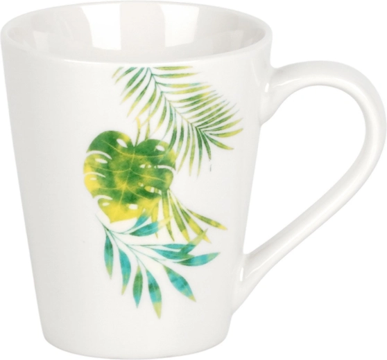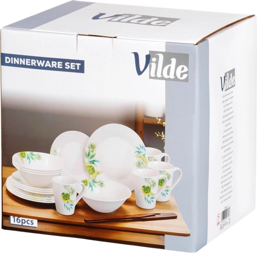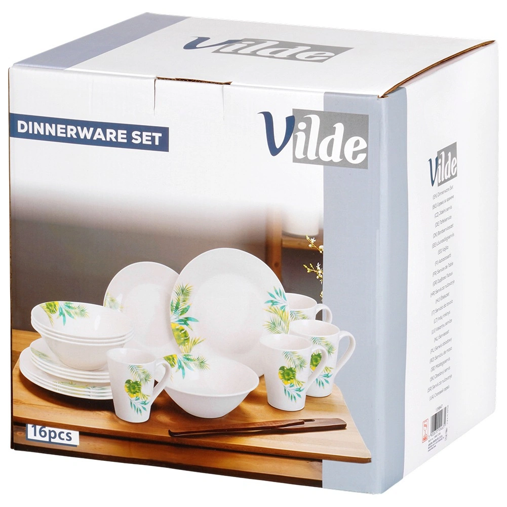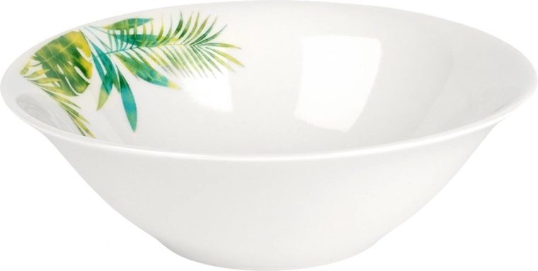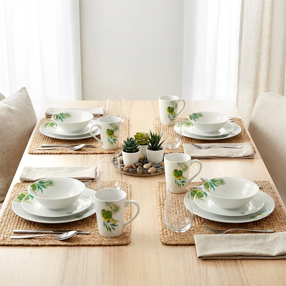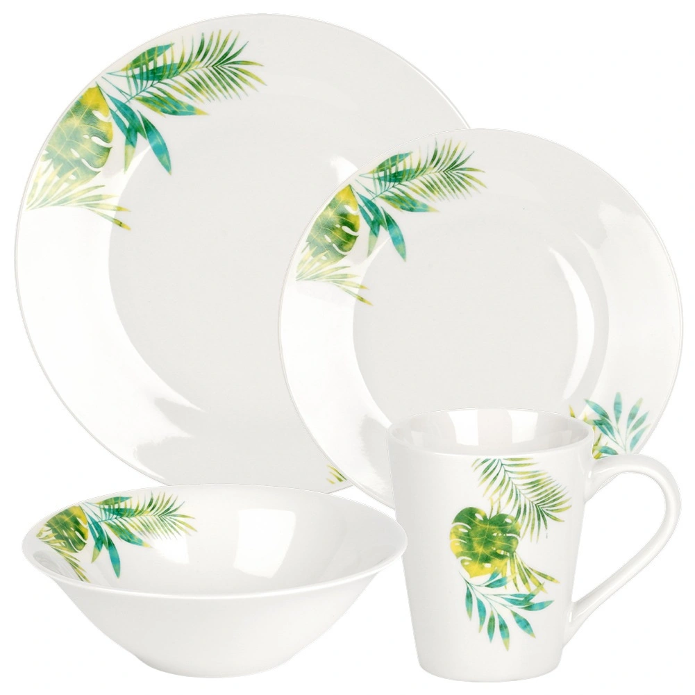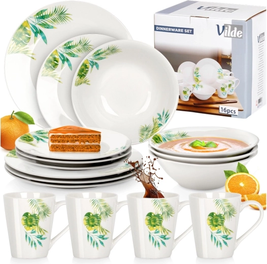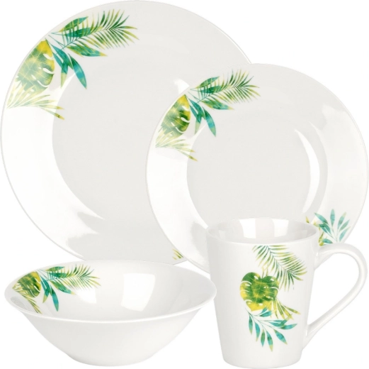 Elegancki porcelanowy zestaw obiadowy dla 4 osób z białą glazurą i tropicznym motywem roślinnym. Zawiera 16 elementów: talerze płytkie i deserowe, miski 600 ml oraz kubki 300 ml. Odpowiedni do zmywarki i mikrofalówki, idealny na co dzień i na wyjątkowe okazje. Ponadczasowy design łatwo dopasujesz do każdej kuchni.