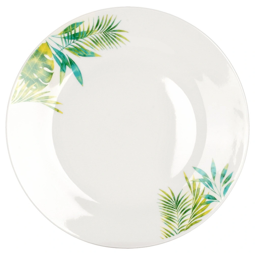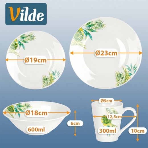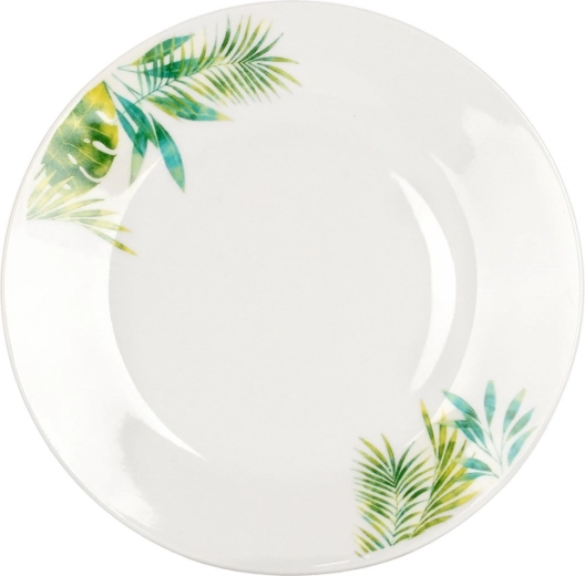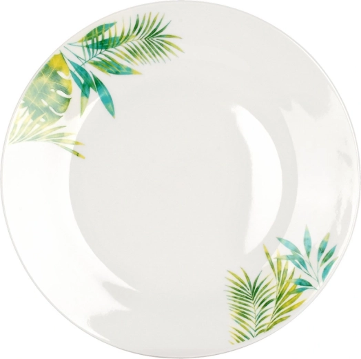 Ten 16‑elementowy porcelanowy zestaw dla 4 osób łączy wysoką jakość wykonania, praktyczne wymiary oraz nowoczesny botaniczny wygląd. Białe tło z tropikalnymi liśćmi nada Twojemu stołowi świeży akcent, a wytrzymała glazura zapewnia łatwą pielęgnację i długą trwałość.