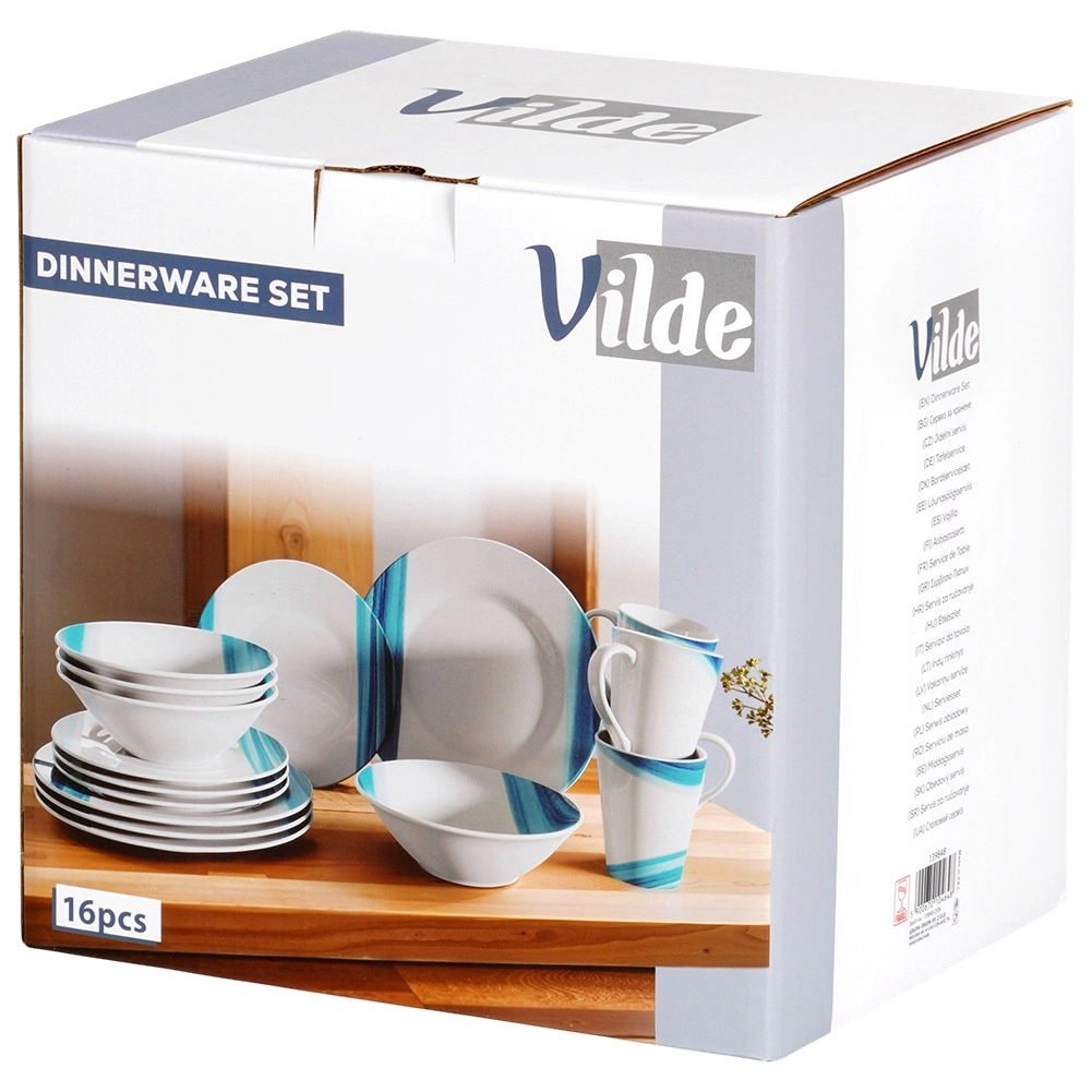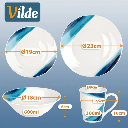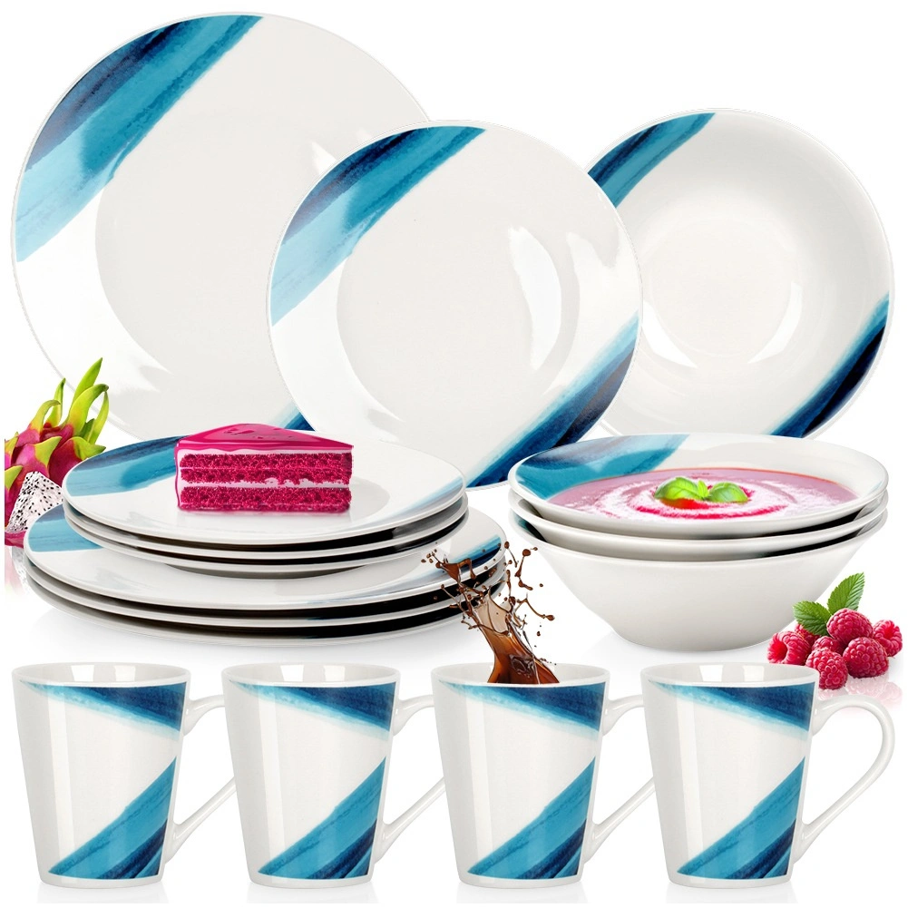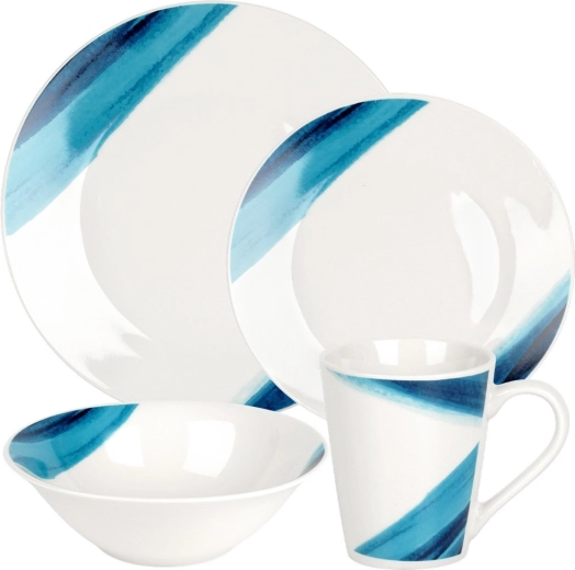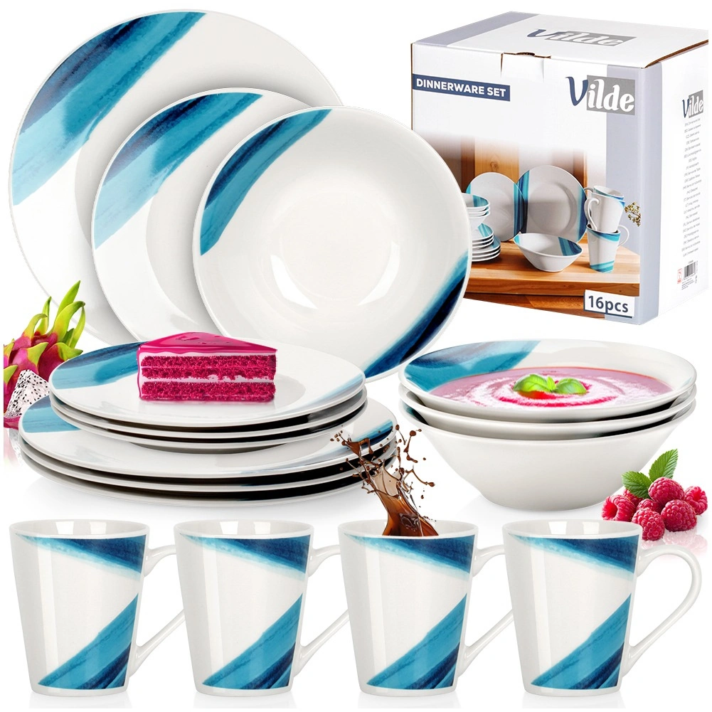 Otrzymasz 16 elementów: 4 miski (18 × 6 cm, 600 ml), 4 płytkie talerze (23 × 23 × 2 cm), 4 talerze deserowe (19 × 19 × 2 cm) oraz 4 kubki (12,5 × 9 × 10 cm, 300 ml). Wszystko utrzymane w spójnym dekorze.