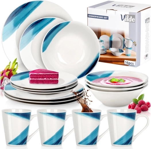 Ten 16‑elementowy porcelanowy zestaw obiadowy łączy w sobie styl, funkcjonalność i trwałość. Biała baza z wyrazistym niebieskim dekorem nadaje każdemu nakryciu stołu świeży i nowoczesny wygląd. Dzięki uniwersalnym rozmiarom jest idealny do serwowania zup, dań głównych, deserów oraz gorących napojów.