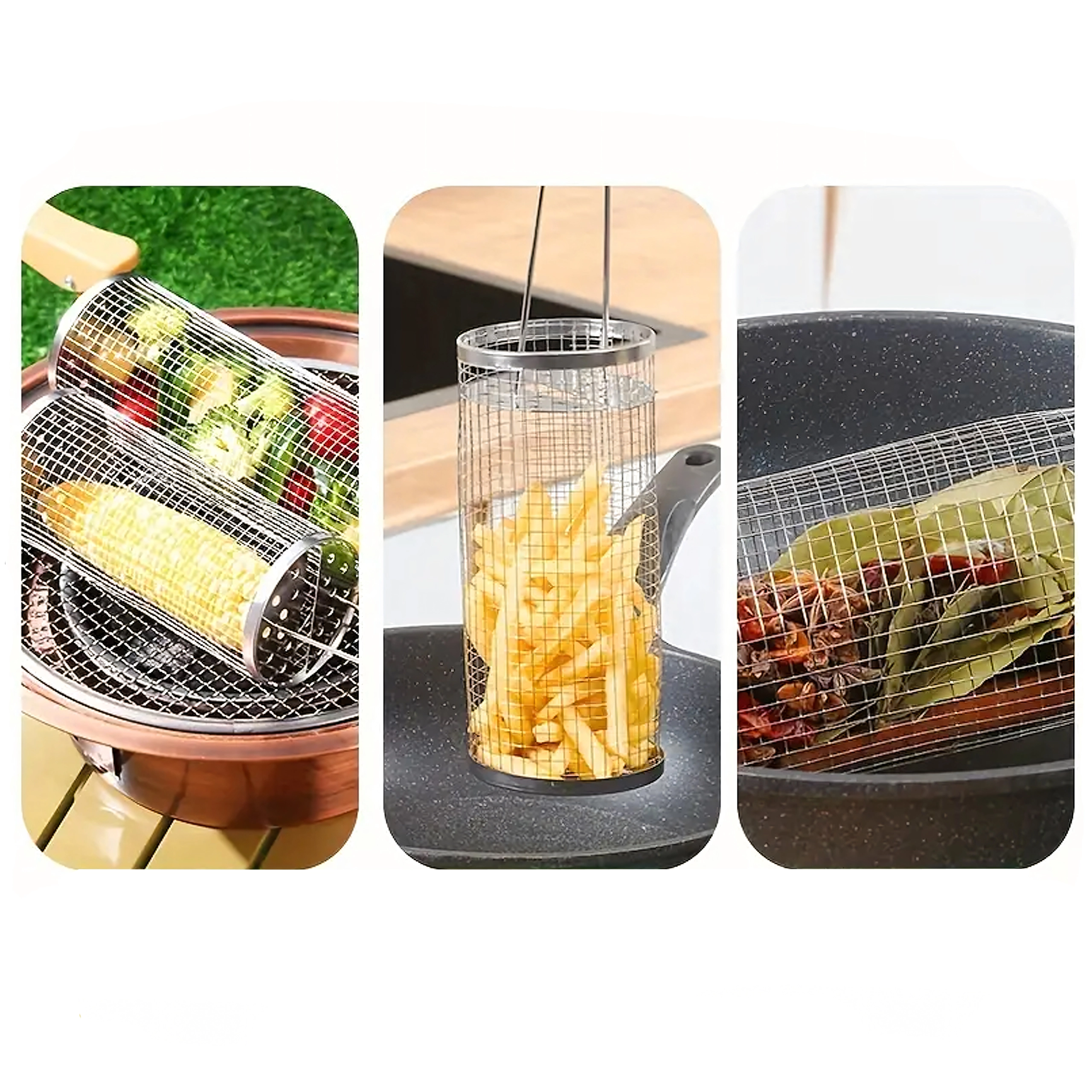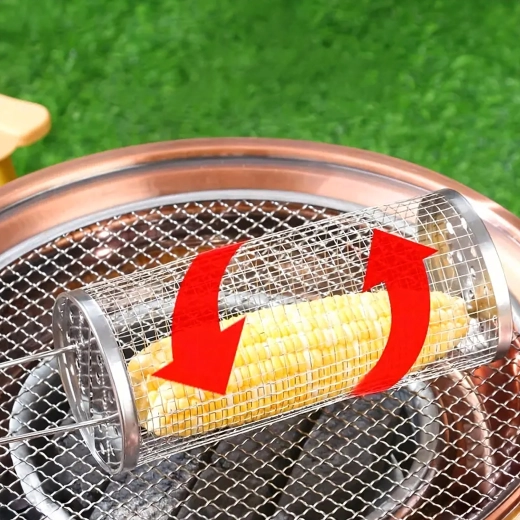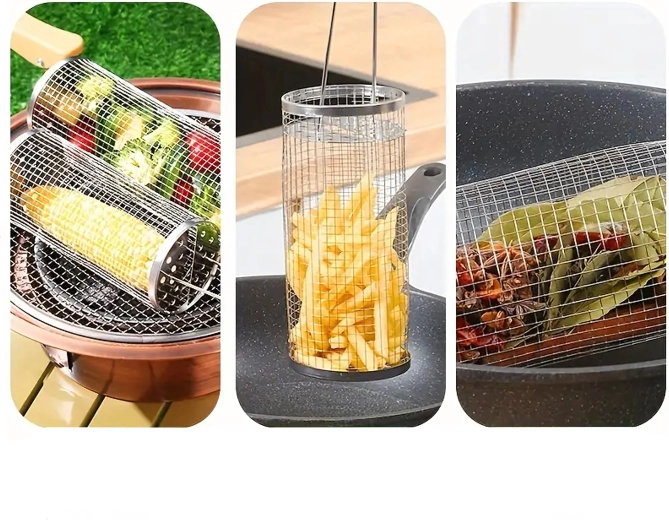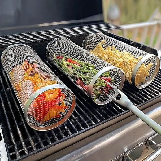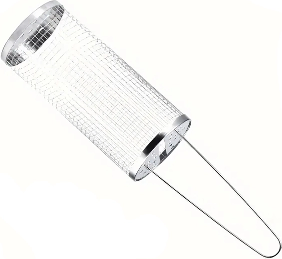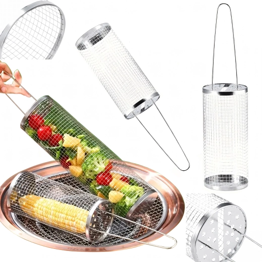 Praktyczny obrotowy kosz do grilla z wytrzymałej stali nierdzewnej do łatwego grillowania małych kawałków, takich jak warzywa, frytki czy ryby. Drobna siatka zapobiega wypadaniu, a jednocześnie umożliwia równomierną cyrkulację ciepła i dymu dla idealnego smaku. Dzięki długiej drucianej rączce obsługa jest bezpieczna i wygodna, a cylindryczny kształt pozwala na płynne obracanie dla równomiernego wypieczenia.