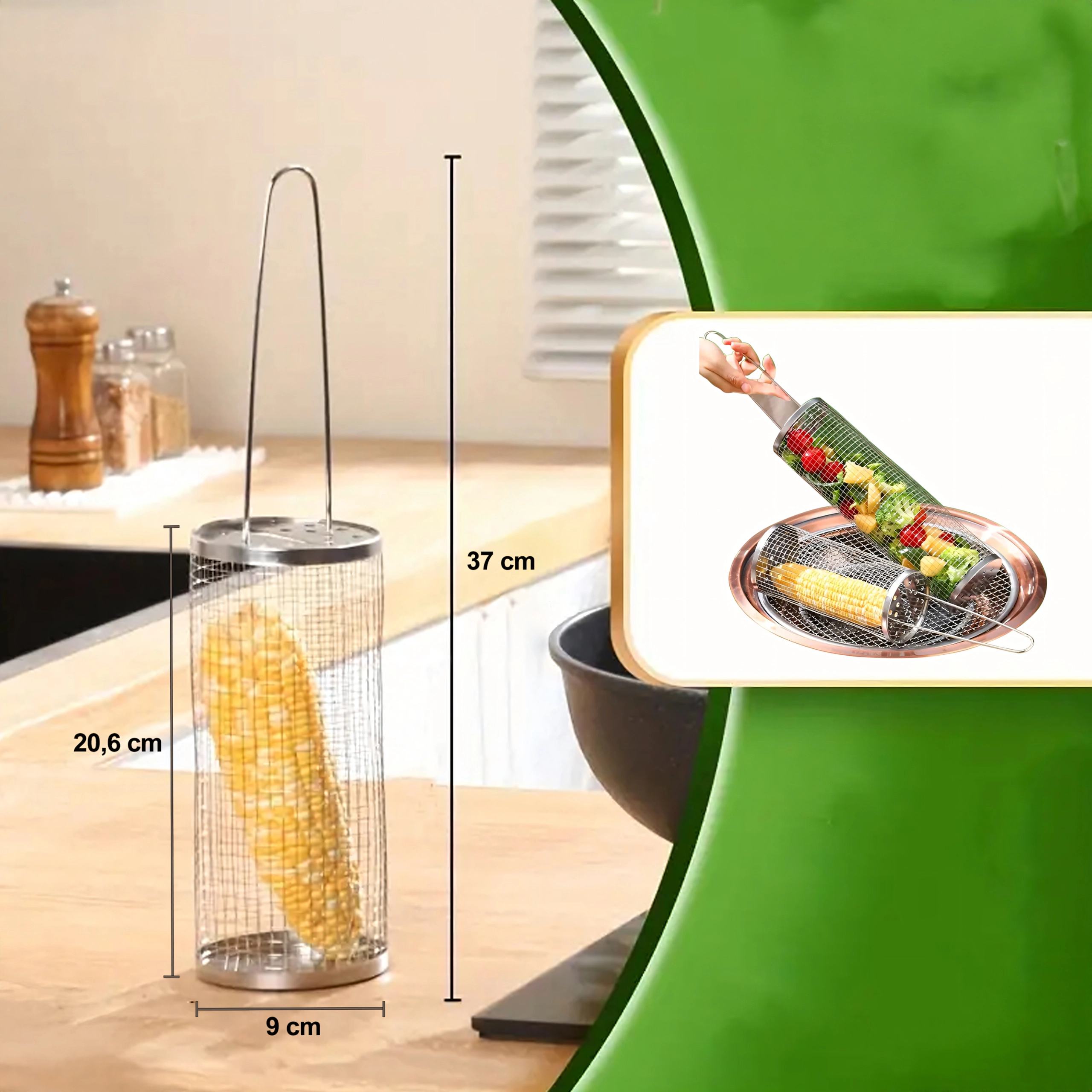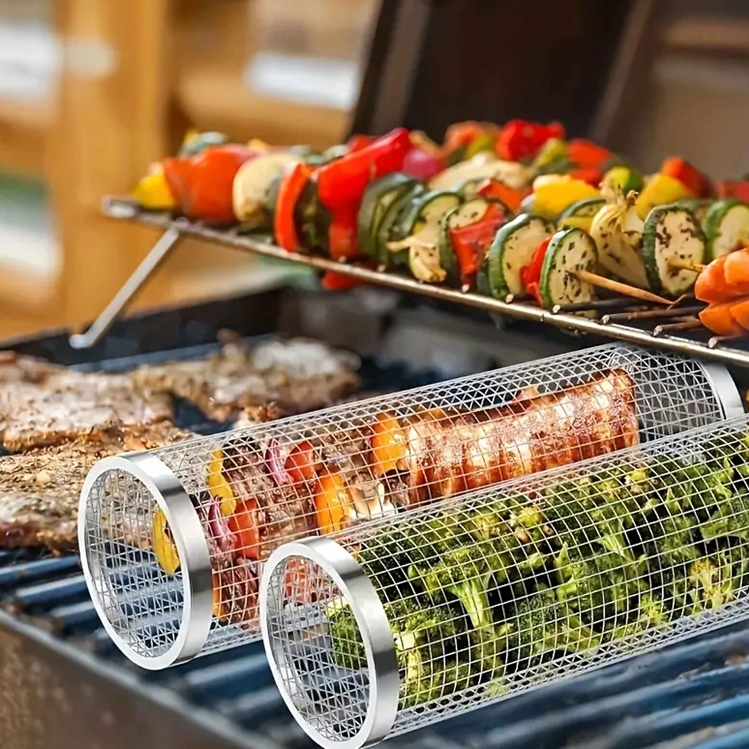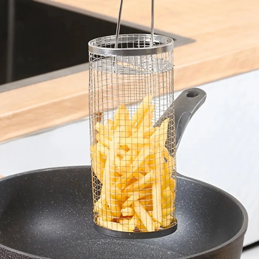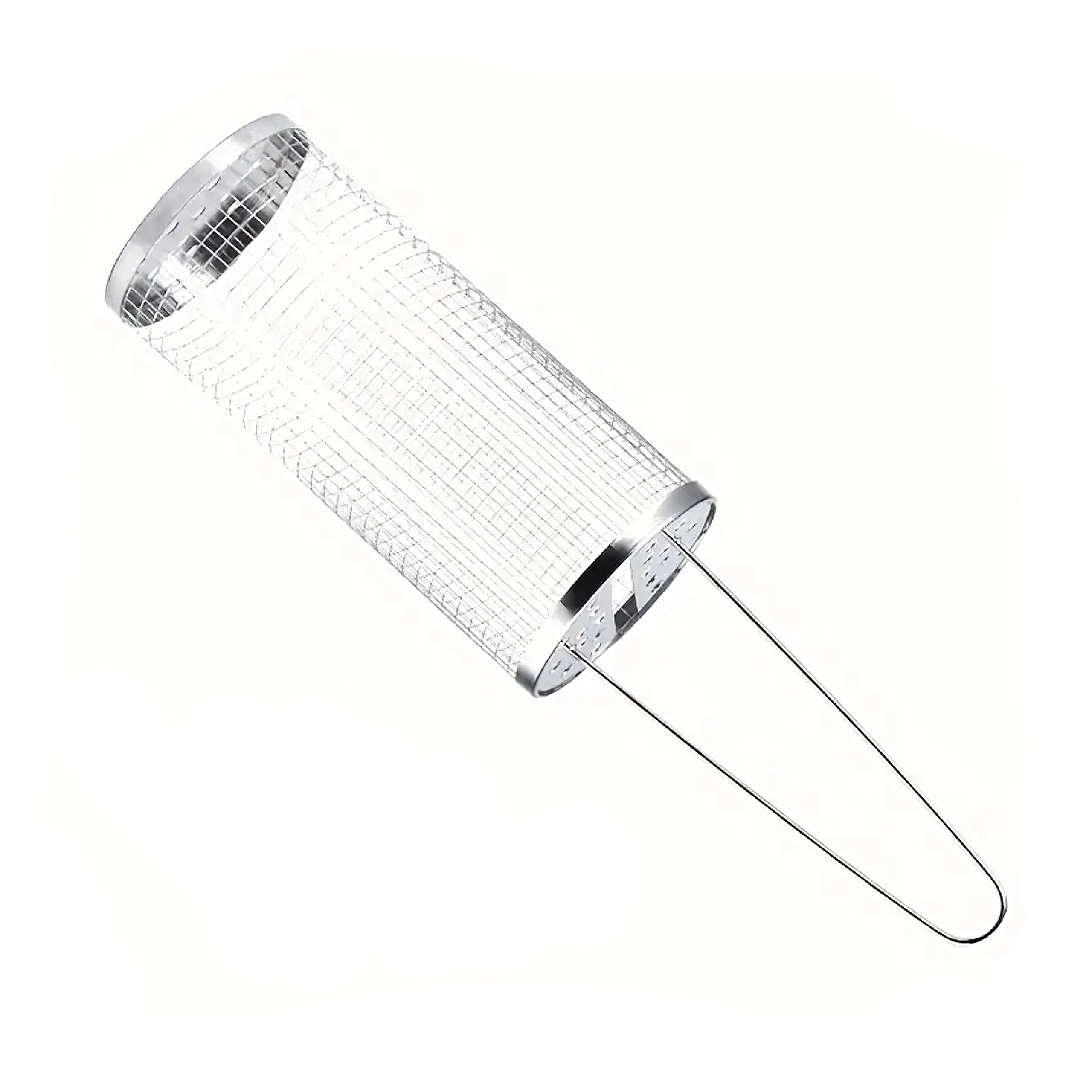 Praktyczny obrotowy kosz do grilla z wytrzymałej stali nierdzewnej do łatwego grillowania małych kawałków, takich jak warzywa, frytki czy ryby. Drobna siatka zapobiega wypadaniu, a jednocześnie umożliwia równomierną cyrkulację ciepła i dymu dla idealnego smaku. Dzięki długiej drucianej rączce obsługa jest bezpieczna i wygodna, a cylindryczny kształt pozwala na płynne obracanie dla równomiernego wypieczenia.