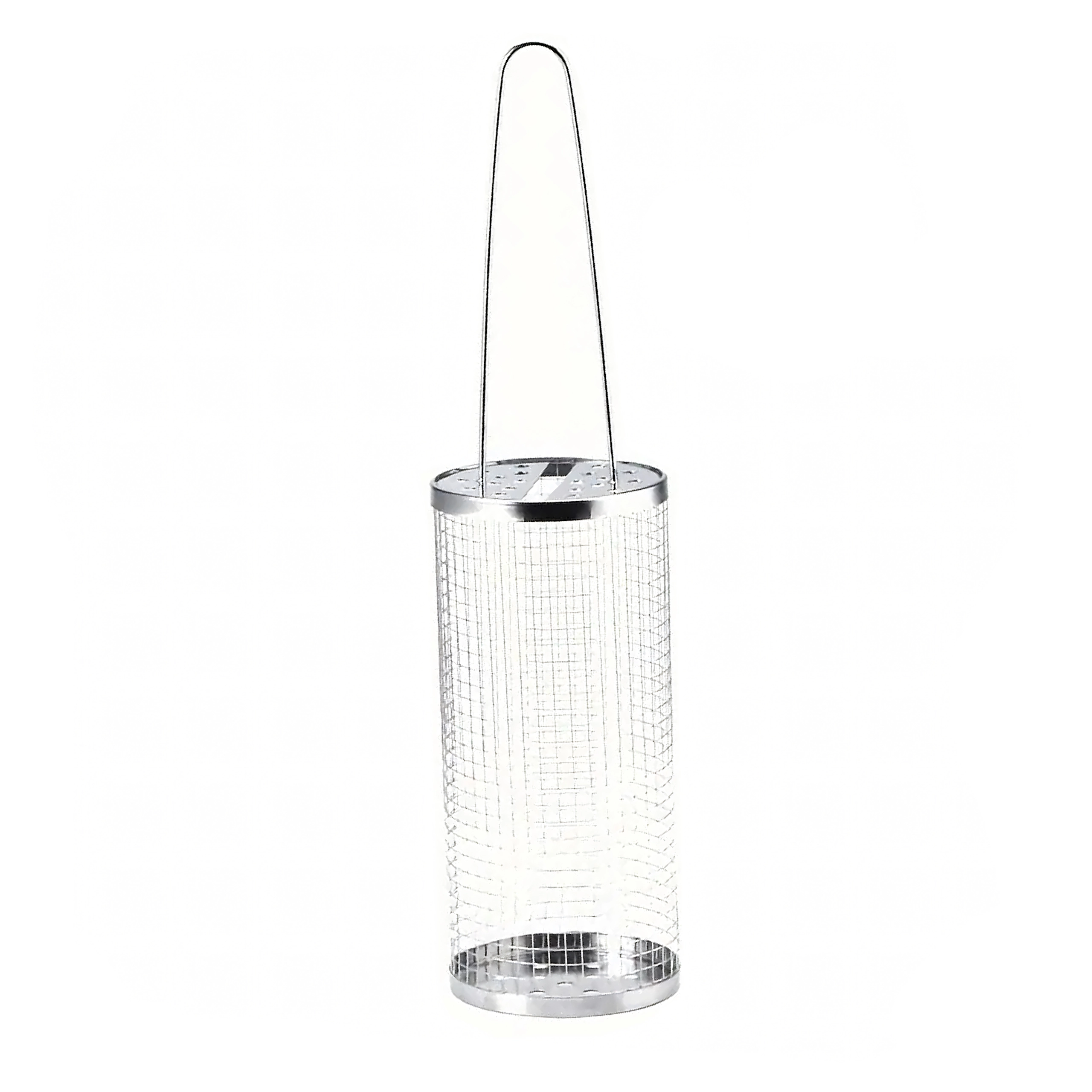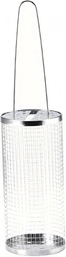 - Cylindryczny kosz z perforowanymi zakończeniami i długą drucianą rączką
