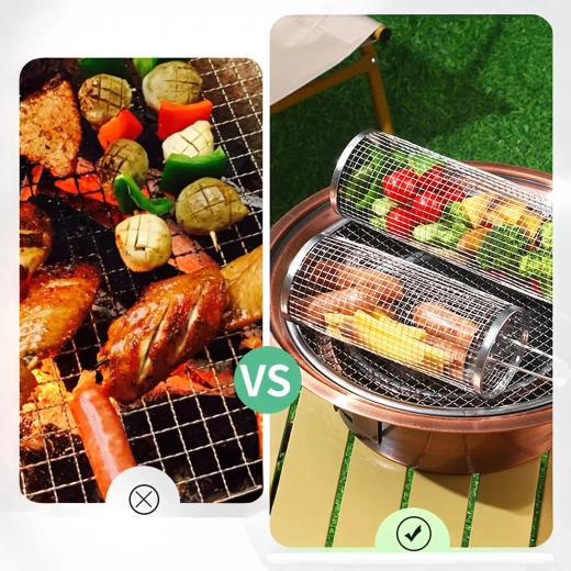Cylindryczny kształt z drobną siatką zapewnia płynne obracanie i równomierne wypieczenie warzyw, ziemniaków oraz mięsa bez ryzyka wpadania przez ruszt.