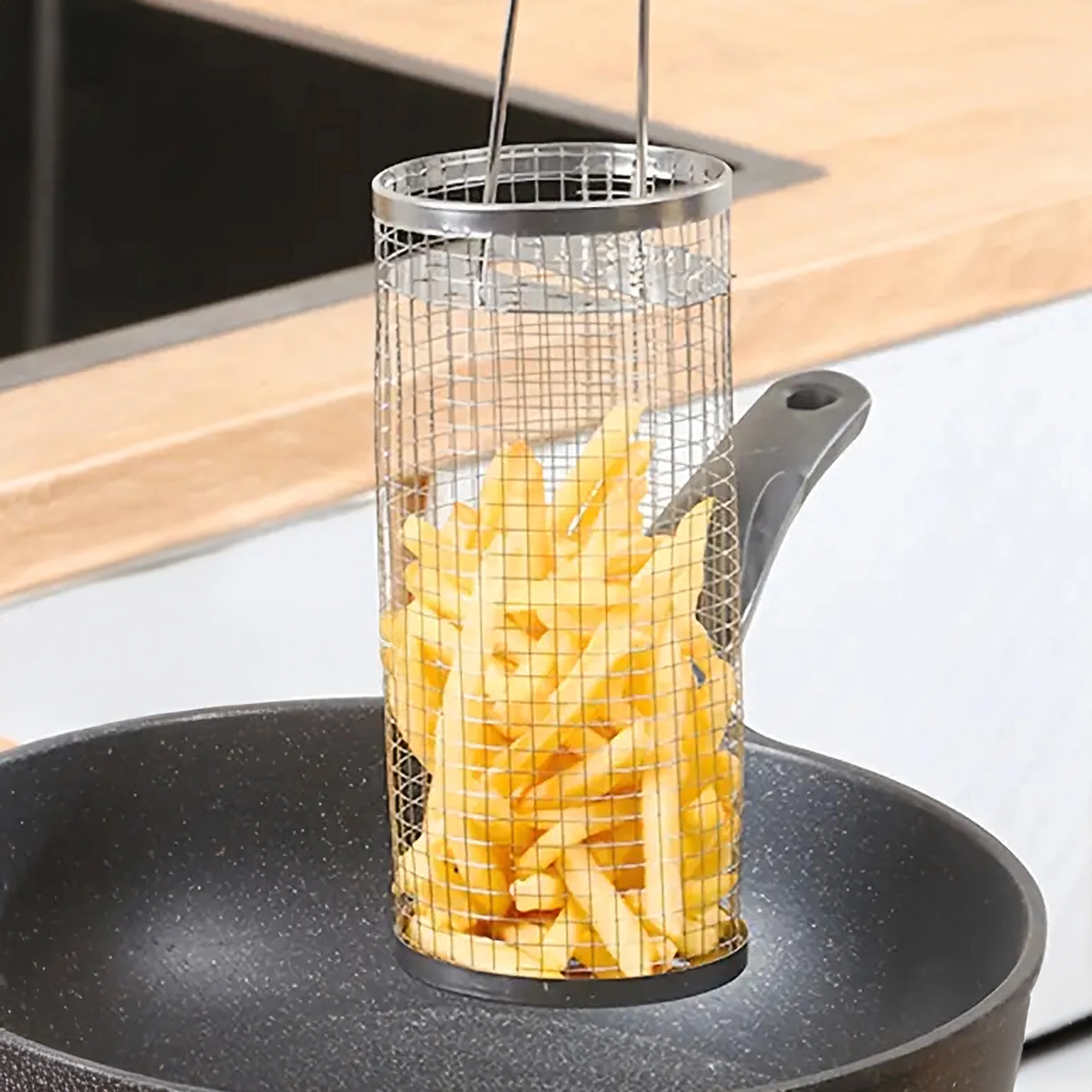 Solidna konstrukcja ze stali nierdzewnej wytrzymuje wysokie temperatury i łatwo się czyści. Długa druciana rączka zapewnia bezpieczny chwyt i wygodne obracanie nawet nad rozgrzanym rusztem. Świetnie sprawdzi się do warzyw, ziemniaków, frytek, mniejszych kawałków mięsa, ryb i owoców morza.