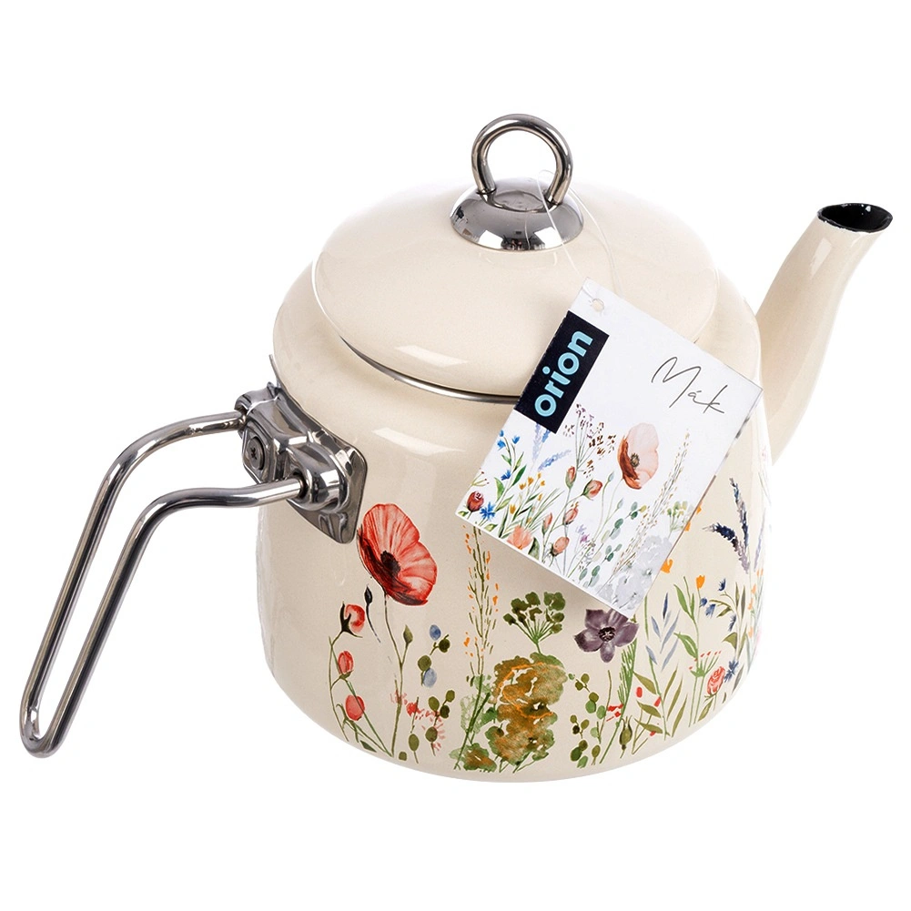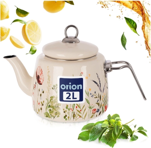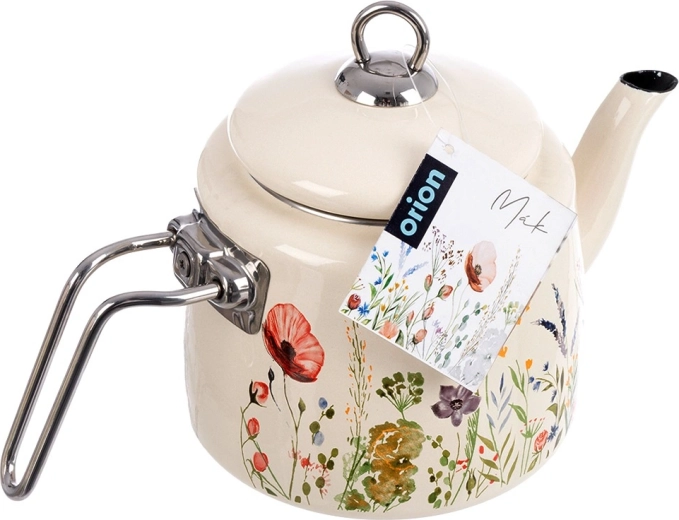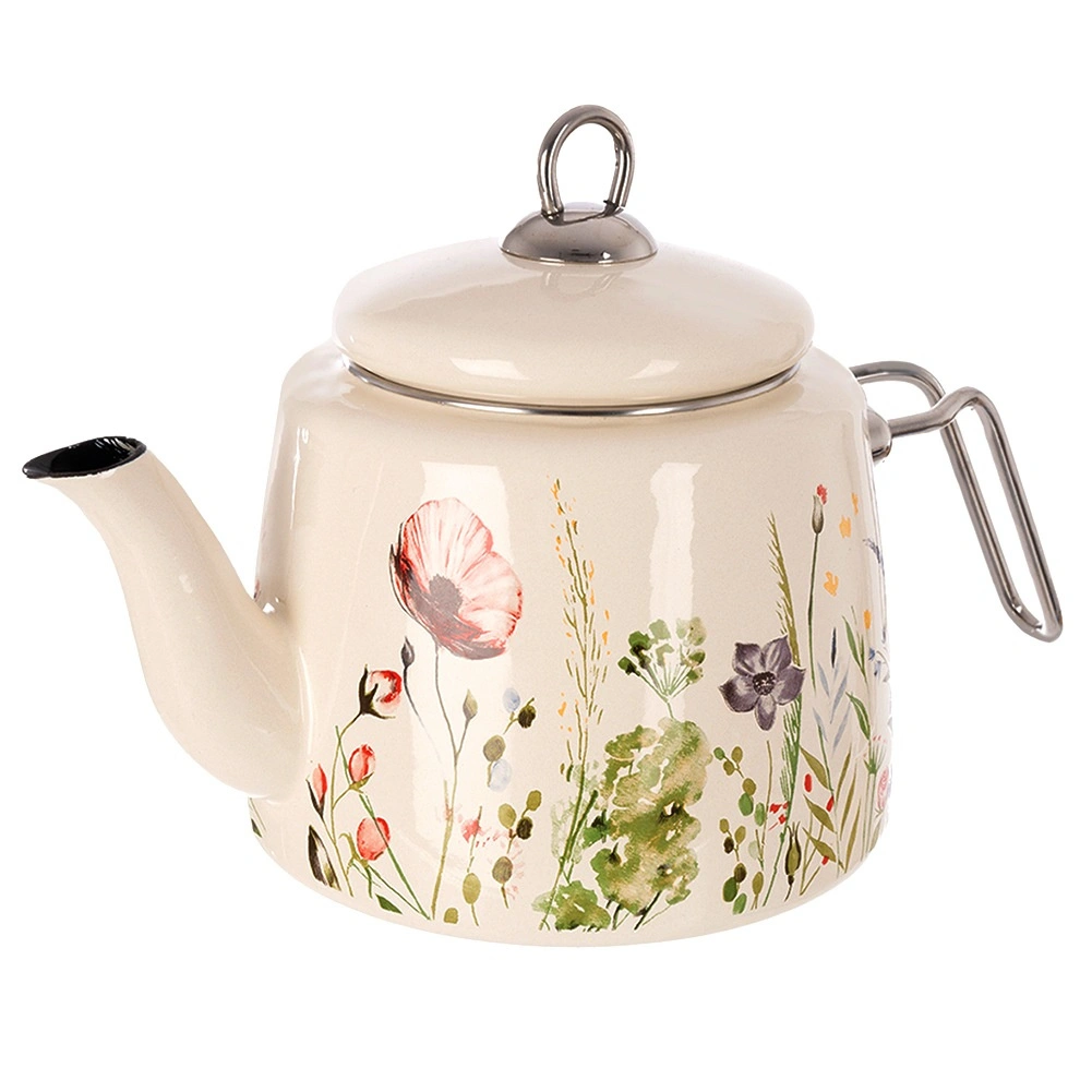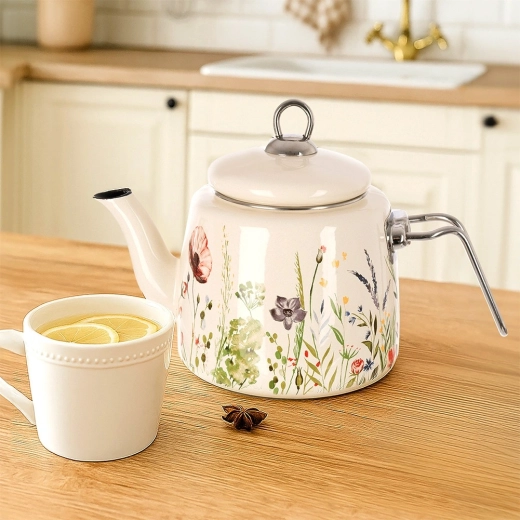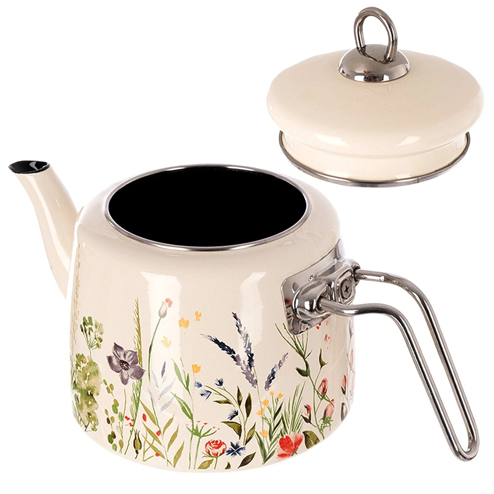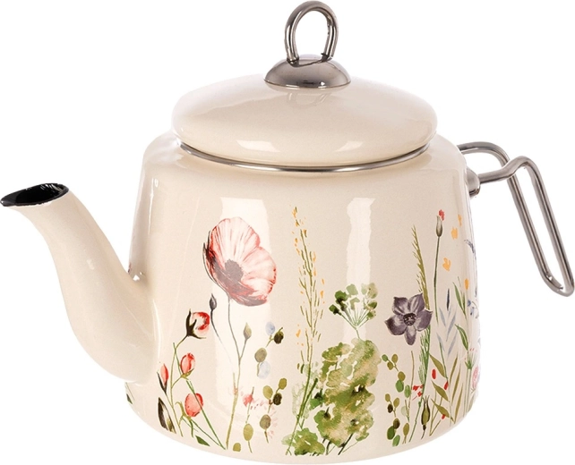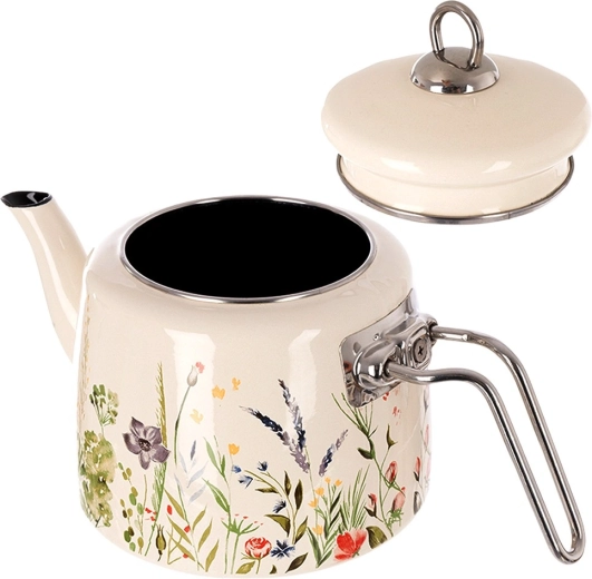 Elegancki emaliowany czajnik o pojemności 1,6 l w kremowym kolorze z motywem łąkowych kwiatów. Wykonany z wysokiej jakości stali emaliowanej z nierdzewnymi uchwytami, odpowiedni na wszystkie typy kuchenek, w tym indukcję, i można go myć w zmywarce. Praktyczna dobrze przylegająca pokrywka pomaga utrzymać ciepło i wygodnie nalewać.
