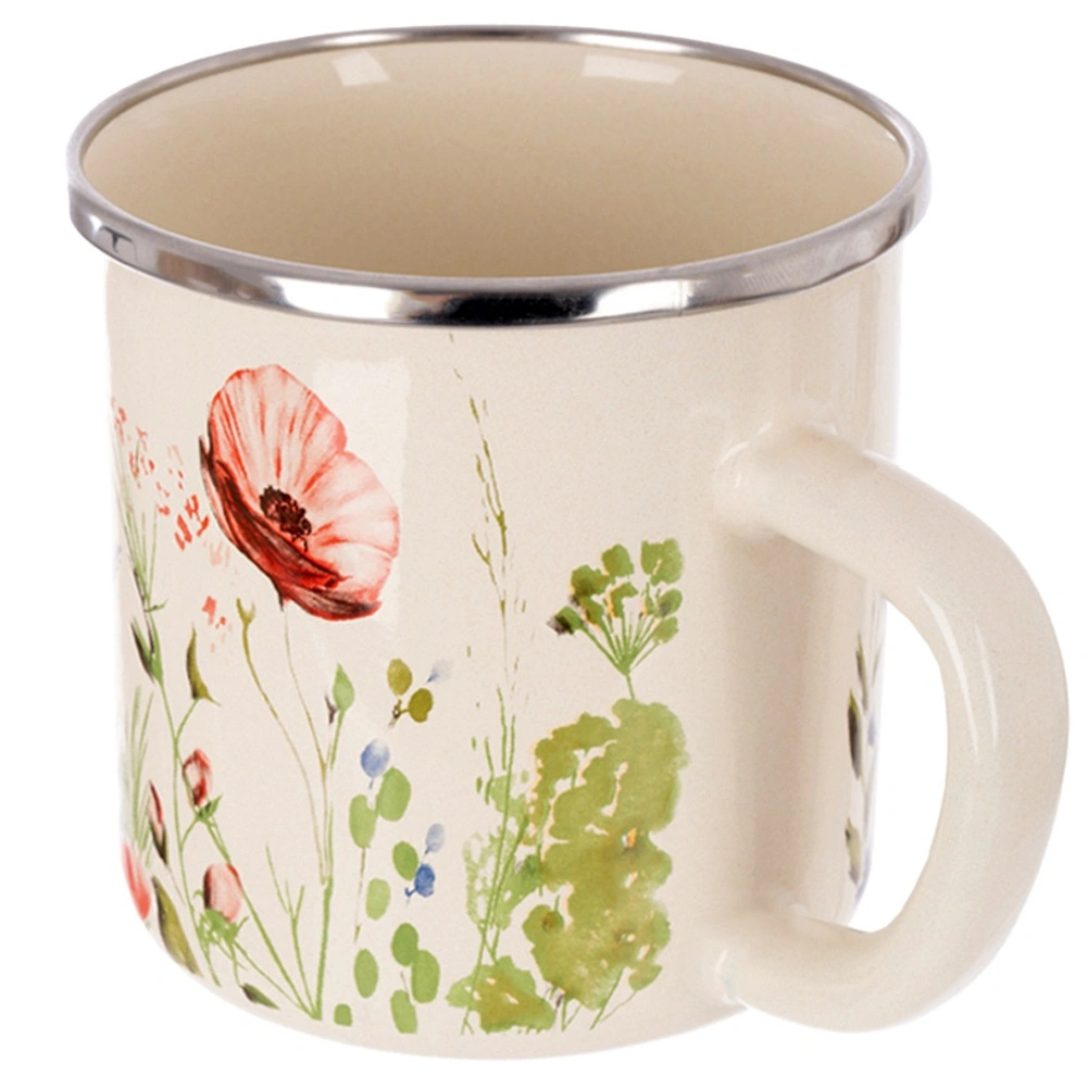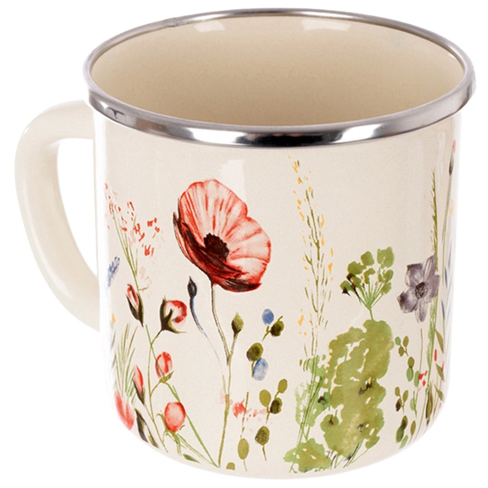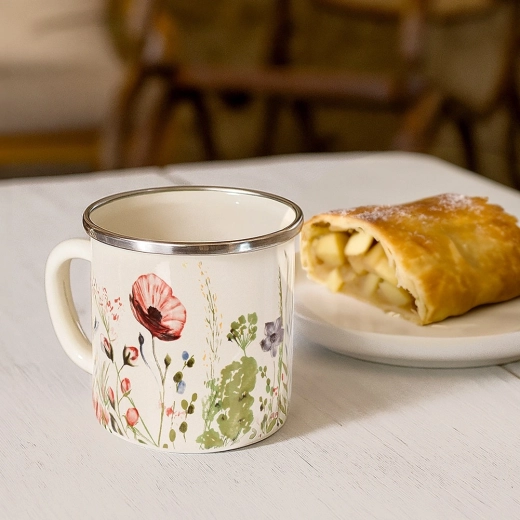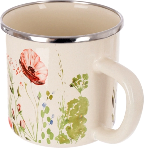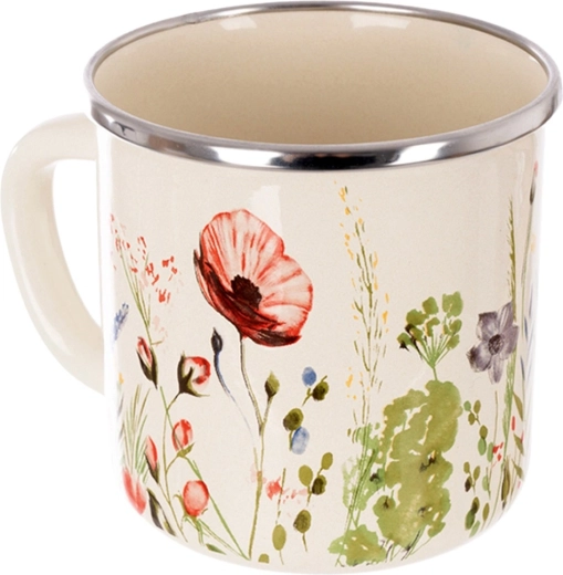 Stylowy emaliowany kubek o pojemności 400 ml w kremowym kolorze z dekoracją polnych kwiatów. Dzięki solidnej konstrukcji i stalowemu, nierdzewnemu rantowi nadaje się do codziennego użytku w domu i na zewnątrz. Bezpieczny materiał, praktyczne ucho, możliwość podgrzewania na kuchence i w piekarniku oraz łatwa pielęgnacja w zmywarce sprawiają, że to świetny wybór do herbaty, kawy i kakao.