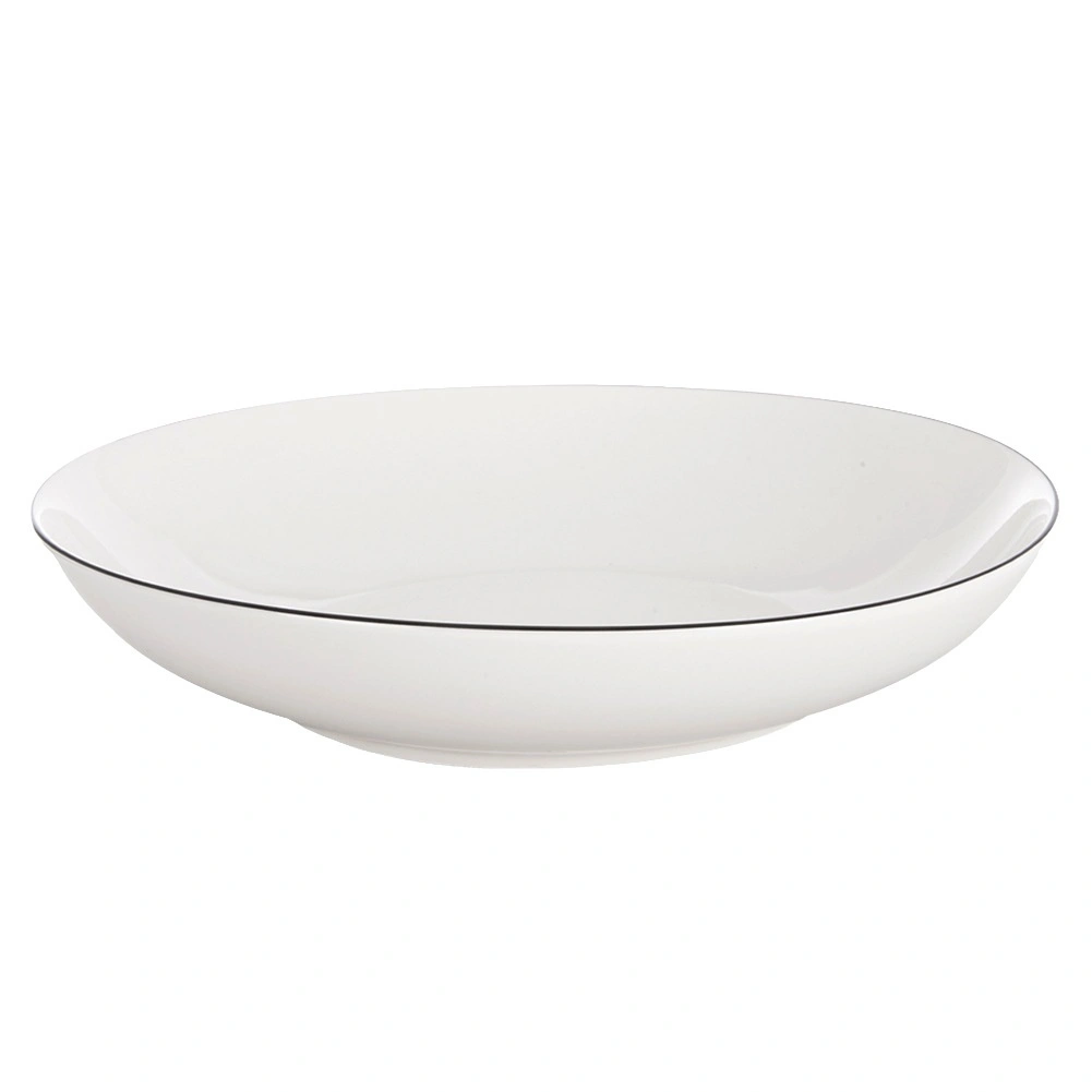 Elegancki głęboki talerz z wysokiej jakości porcelany w białym kolorze z cienką ciemną lamówką. Idealny do zup, makaronów i sałatek, o pojemności 600 ml i średnicy 20 cm. Odpowiedni do zmywarki i kuchenki mikrofalowej, doskonale sprawdzi się na co dzień i na uroczyste okazje.