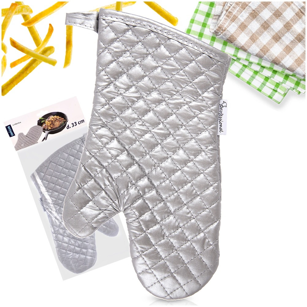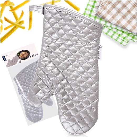 Praktyczna rękawica kuchenna w uniwersalnym rozmiarze chroni Twoje dłonie podczas manipulowania gorącymi naczyniami aż do 250 °C. Dzięki wielowarstwowej izolacji, srebrnemu wykończeniu ochronnemu oraz przeszyciom antypoślizgowym jest lekka, wytrzymała i wygodna do codziennego gotowania, pieczenia i grillowania.