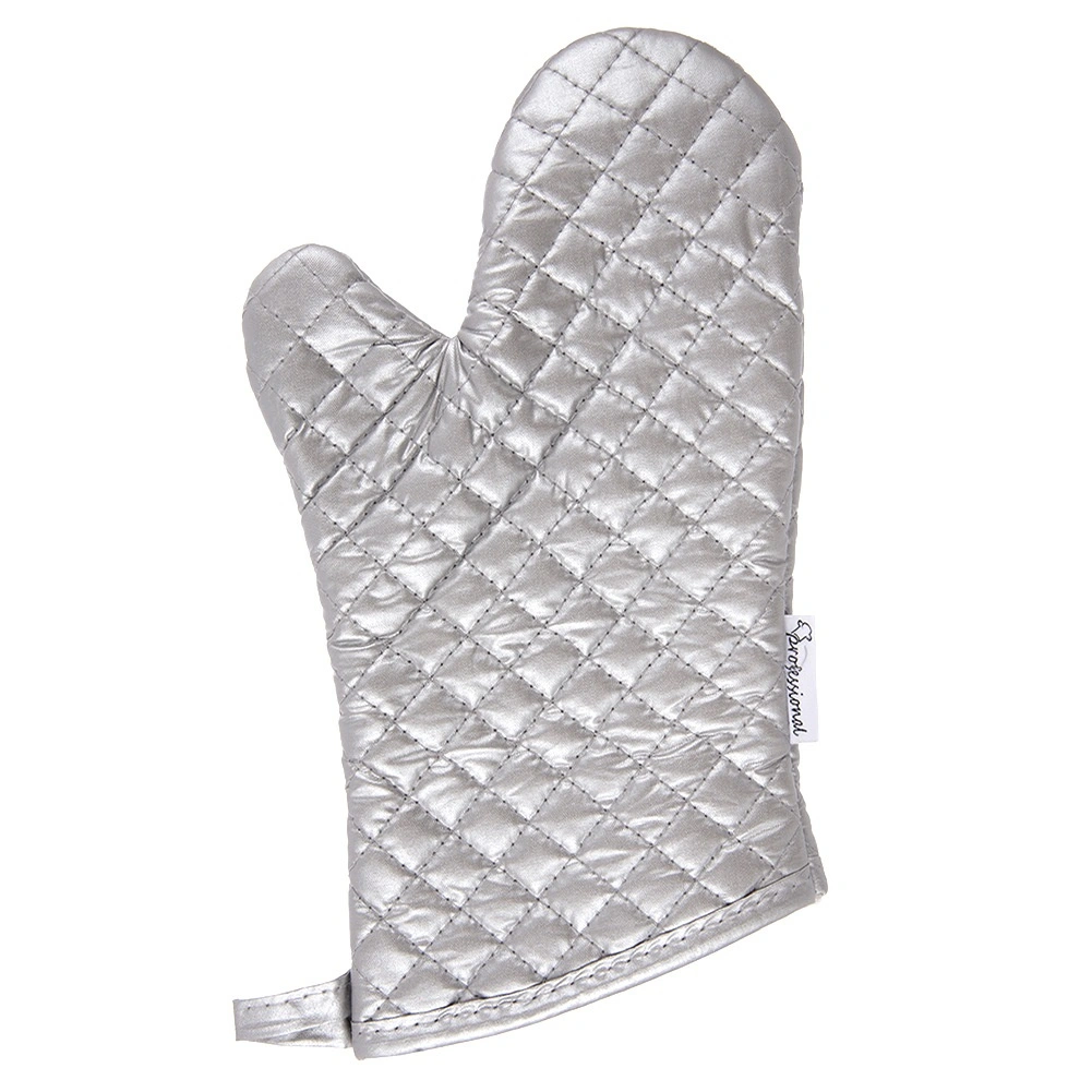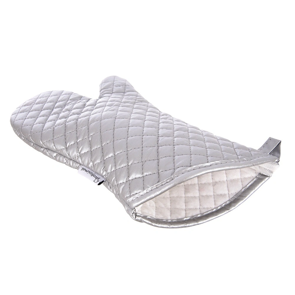 Ta srebrna bawełniana rękawica o wymiarach 18 × 33 cm została zaprojektowana do bezpiecznego przenoszenia gorących blach, brytfann i garnków. Zewnętrzne akrylowe wykończenie powierzchni odpycha zabrudzenia i wilgoć, a miękkie wypełnienie z pikowaniem zapewnia niezawodną izolację termiczną i pewny chwyt.