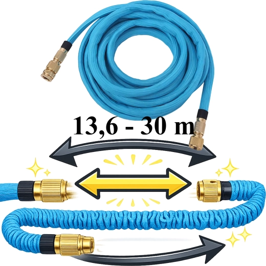 Wąż pod wpływem ciśnienia wody wydłuża się z 13,6 m do 30 m, a po użyciu samoczynnie się kurczy. Łatwy do przenoszenia i przechowywania bez bałaganu.