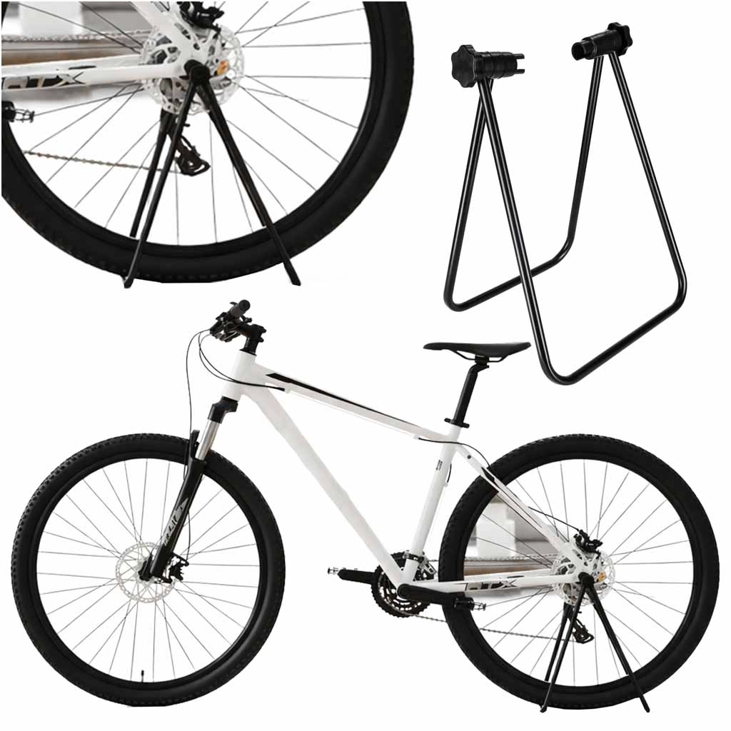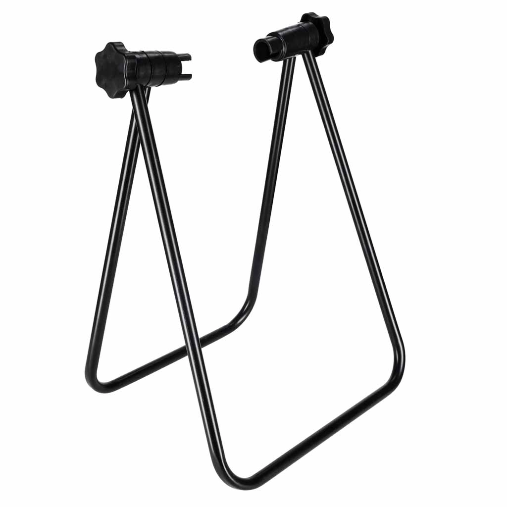 Trójkątna podstawa i gumowe punkty oparcia utrzymują rower stabilnie w pozycji pionowej dla precyzyjnej regulacji hamulców i napędu.
