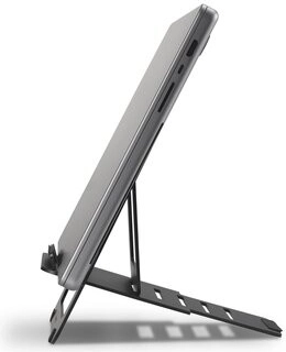Ultracienkie body (zaledwie 6 mm) i waga 420 g umożliwiają składanie całkowicie na płasko – idealne do torby lub plecaka. W zestawie znajduje się ochronny bawełniany woreczek przeciw zarysowaniom. Podstawka szybko dopasowuje się do różnych konfiguracji stanowiska pracy, w tym do biurek z regulacją wysokości.