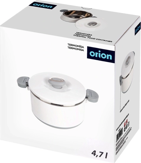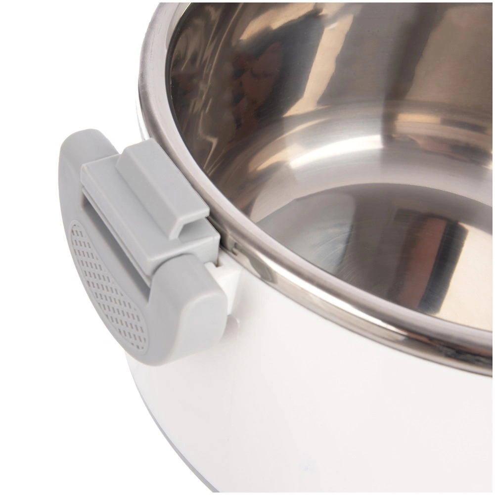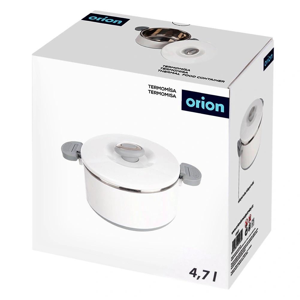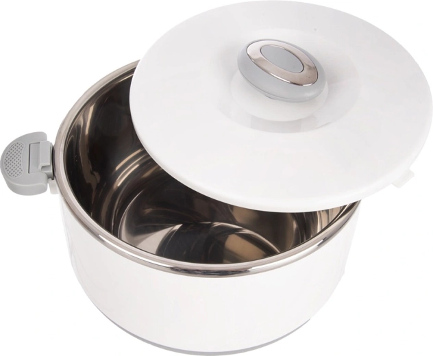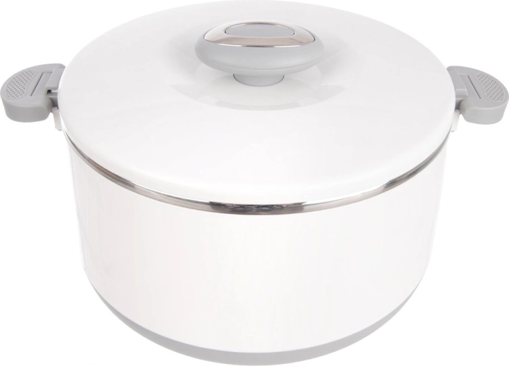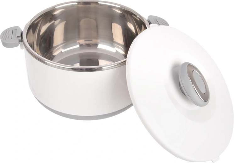 Duża pojemność 4,2 l pomieści całe obiady, dodatki i desery. Wewnętrzna część ze stali nierdzewnej dobrze utrzymuje temperaturę, a wytrzymały biały płaszcz z plastiku i szare uchwyty zapewniają wygodną i bezpieczną obsługę. Pokrywkę zamyka się przez przekręcenie, a boczne klipsy zwiększają pewność podczas przenoszenia.