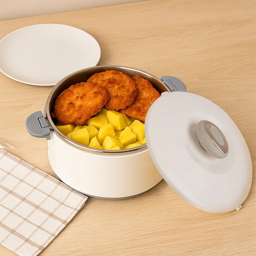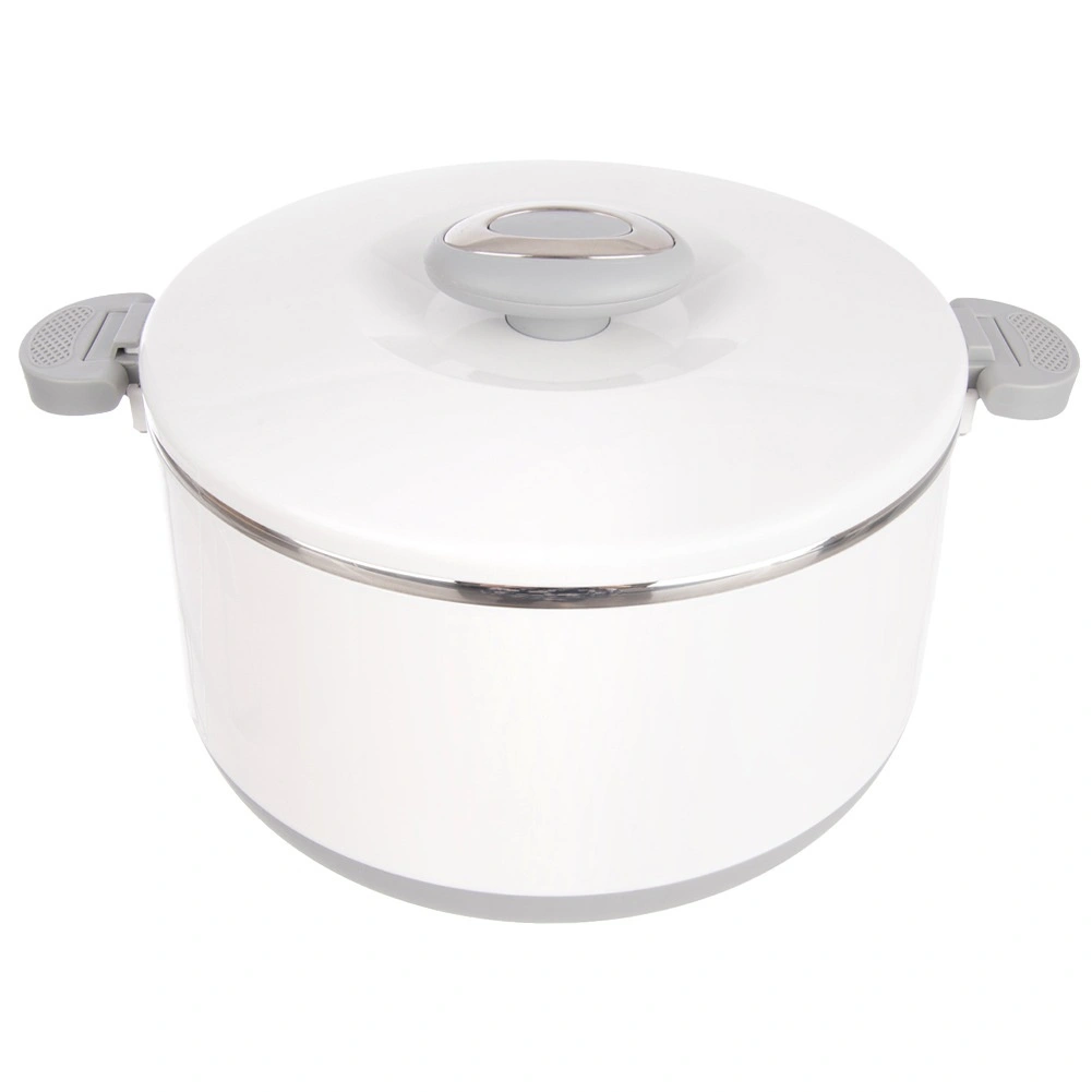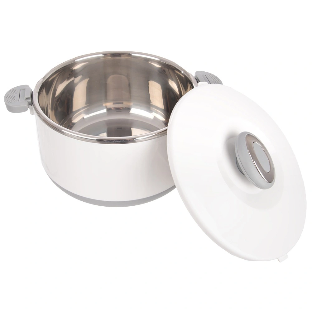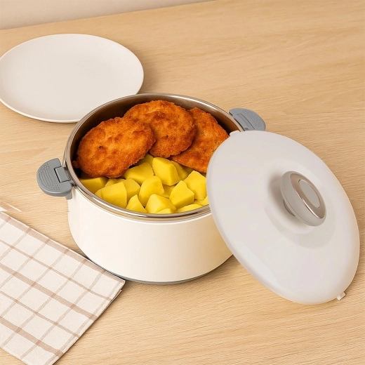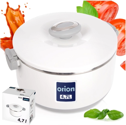 Duża pojemność 4,2 l pomieści całe obiady, dodatki i desery. Wewnętrzna część ze stali nierdzewnej dobrze utrzymuje temperaturę, a wytrzymały biały płaszcz z plastiku i szare uchwyty zapewniają wygodną i bezpieczną obsługę. Pokrywkę zamyka się przez przekręcenie, a boczne klipsy zwiększają pewność podczas przenoszenia.