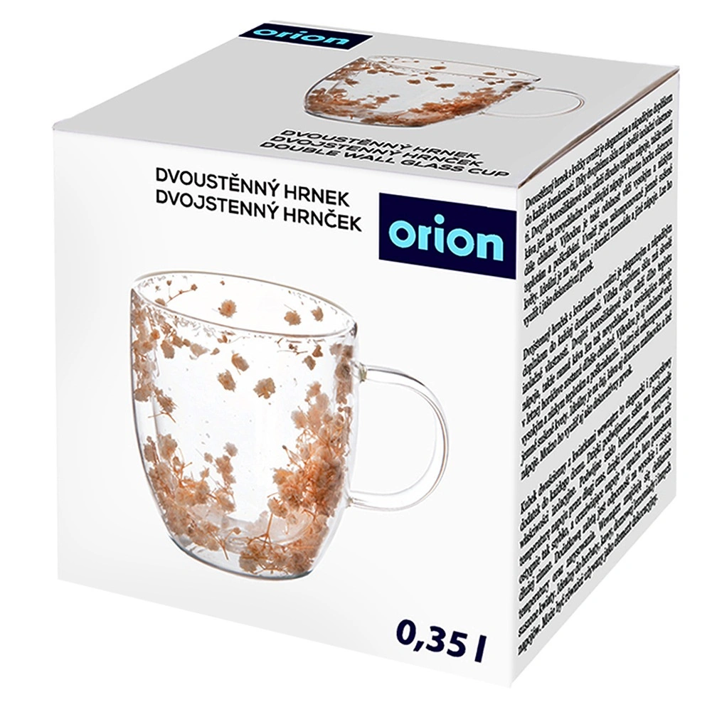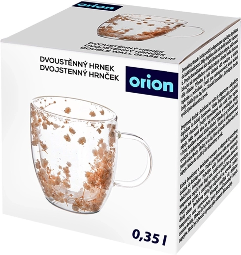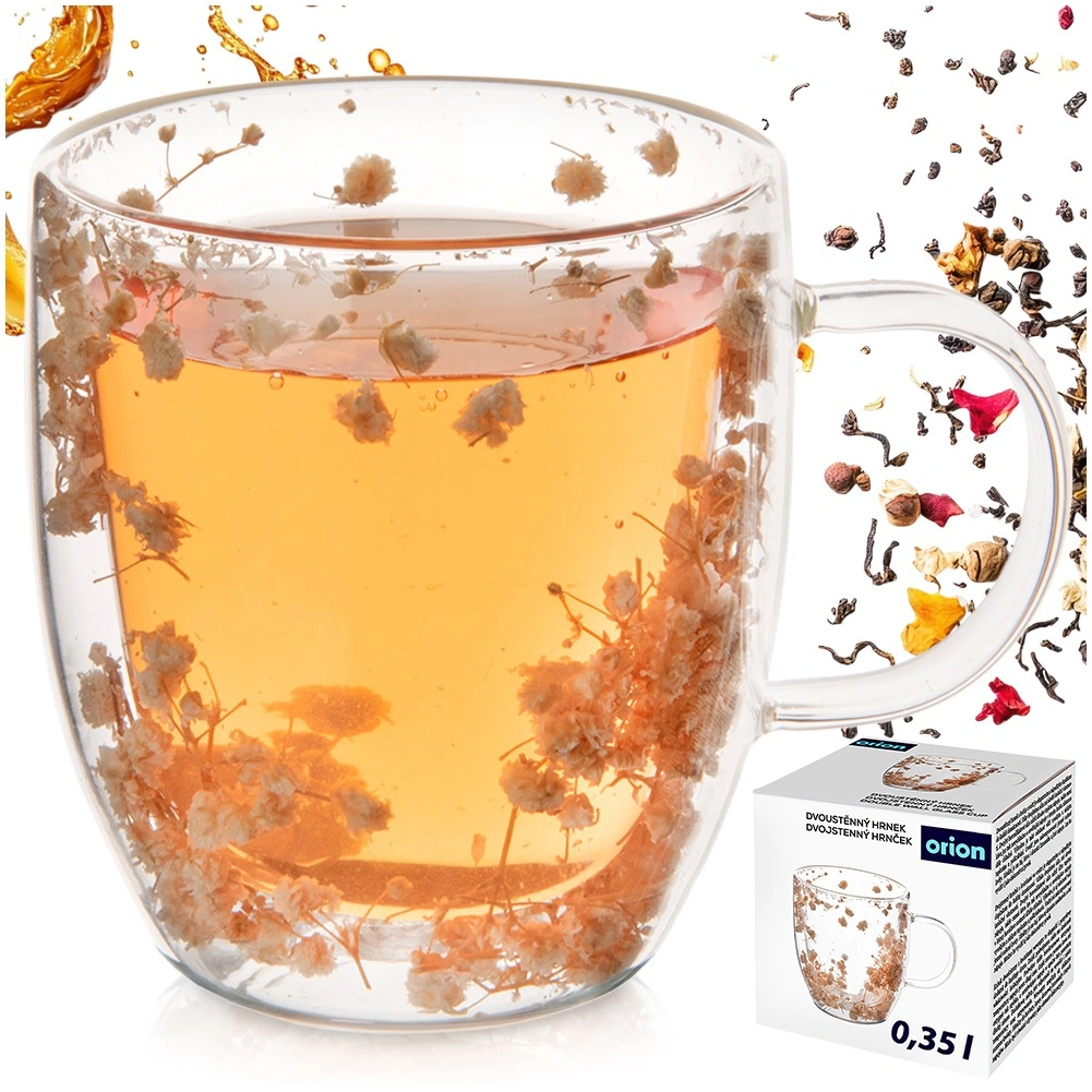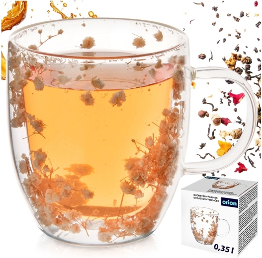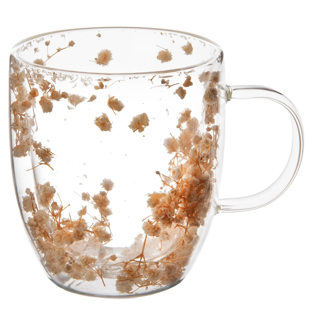 Elegancki szklany kubek z podwójną ścianką dłużej utrzymuje napoje ciepłe i zimne. Wykonany z szkła borokrzemowego, jest odporny na temperatury od -10 °C do +150 °C, zarysowania i chemikalia. Wygodne ucho oraz oryginalna dekoracja z suszonych kwiatów między ściankami dodają każdemu łykowi stylu.