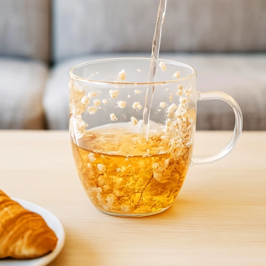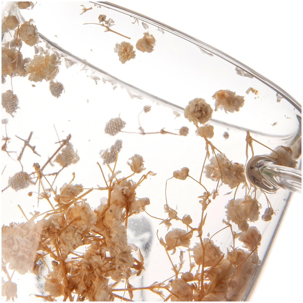 Delektuj się kawą, herbatą lub kakao w kubku, który łączy funkcjonalność i design. Podwójne szkło borokrzemowe zapewnia lepszą izolację termiczną, dzięki czemu napój nie chłodzi się ani nie nagrzewa zbyt szybko, a zewnętrzna ścianka pozostaje przyjemna w dotyku. Przezroczyste wykonanie z delikatnymi suszon ymi kwiatami między ściankami sprawia, że kubek jest dekoracyjnym elementem na każdym stole.