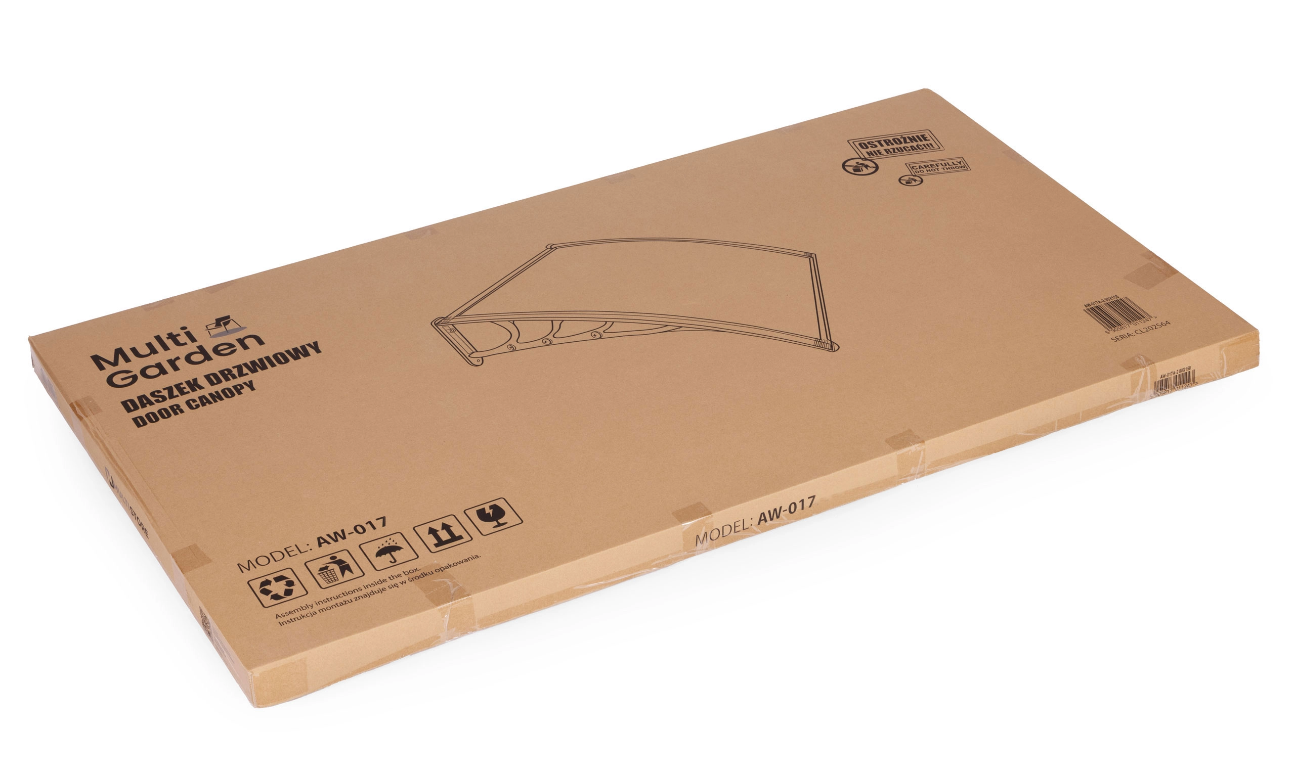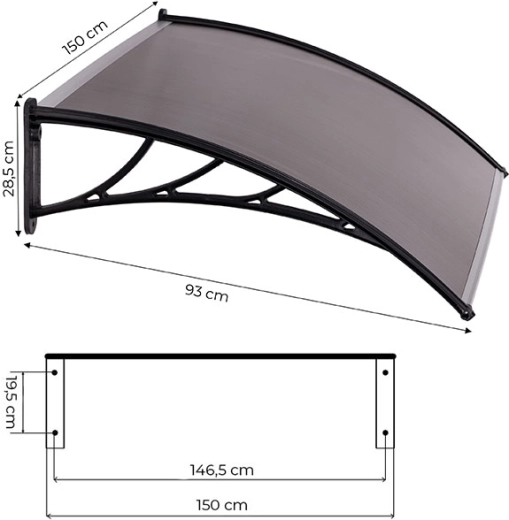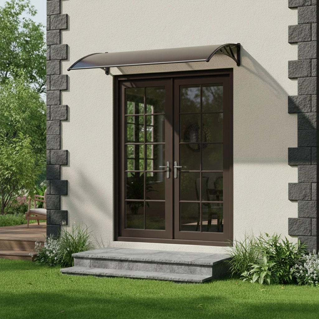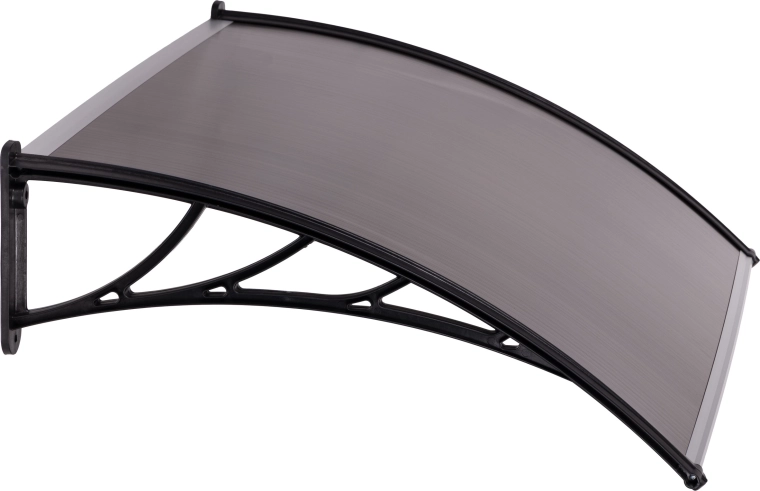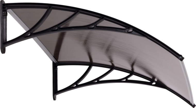 Wygięty, półprzezroczysty daszek osłania drzwi i otoczenie, przepuszcza światło dzienne, a jednocześnie chroni przed opadami i promieniowaniem UV. Odpowiedni do domów i lokali użytkowych.