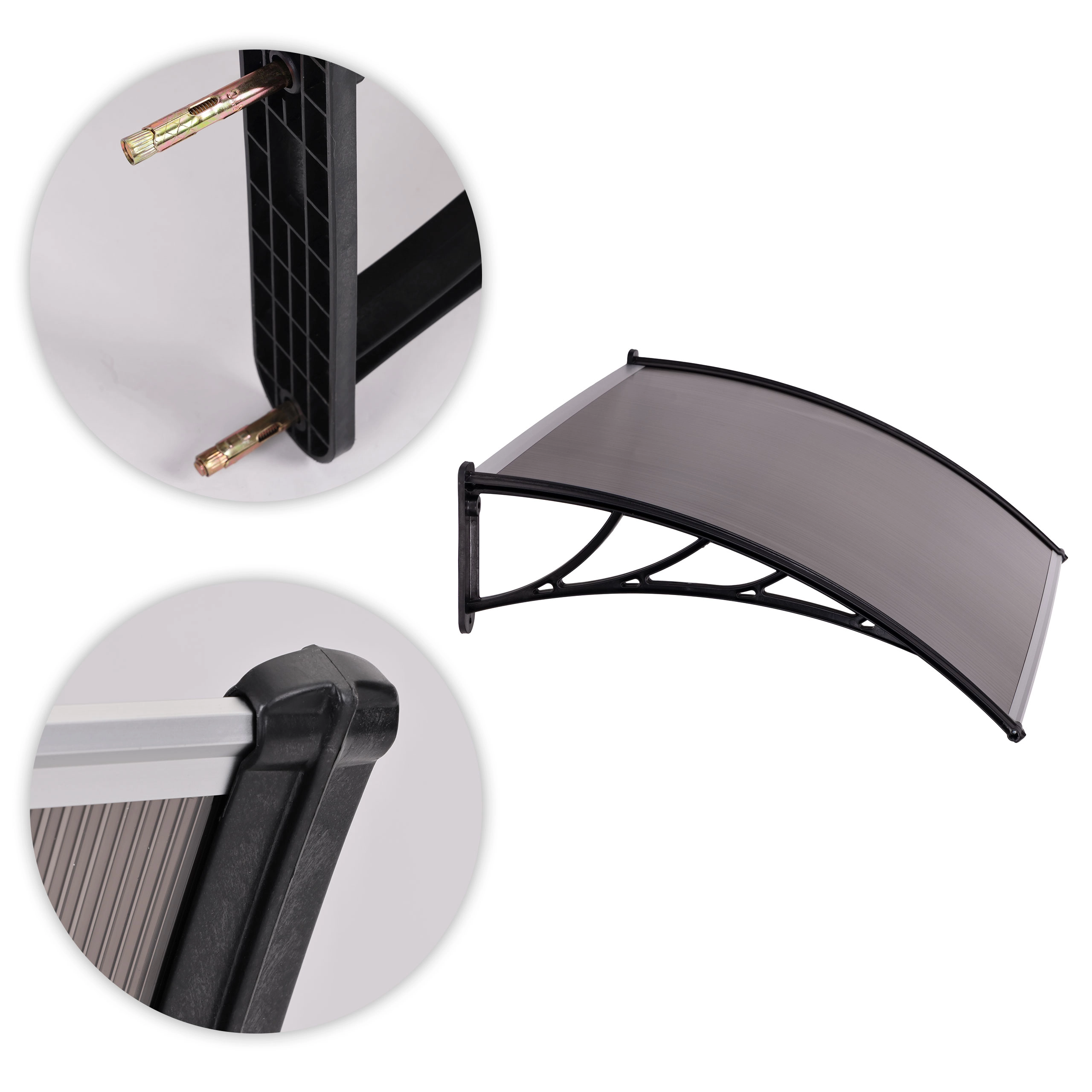 System modułowy pozwala poszerzyć zadaszenie wejścia poprzez połączenie kilku daszków obok siebie. W opakowaniu znajdują się metalowe kotwy rozporowe w trzech długościach, które zapewnią pewne mocowanie w murze oraz na ocieplonych elewacjach. Montaż w 4 punktach kotwienia gwarantuje stabilność i bezpieczeństwo w codziennym użytkowaniu.
