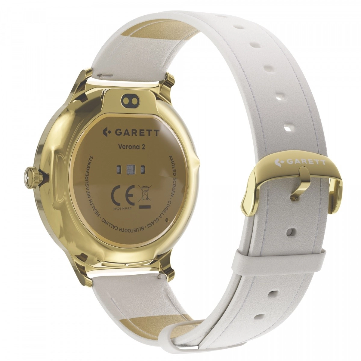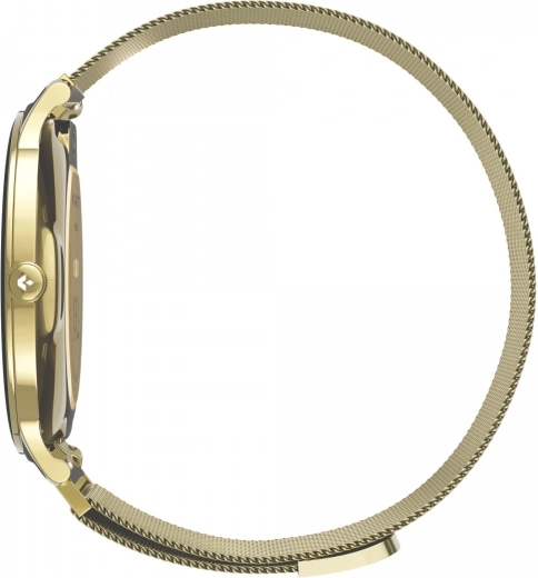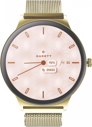 GARETT VERONA 2 to damski smartwatch o smukłej konstrukcji (zaledwie 7,5 mm), który świetnie pasuje do codziennych i wieczorowych stylizacji. Wymienna złota bransoleta mesh oraz biały skórzany pasek w zestawie pozwalają natychmiast dopasować styl do okazji. Obsługa jest wygodna dzięki obrotowej koronce i przejrzystemu interfejsowi.
