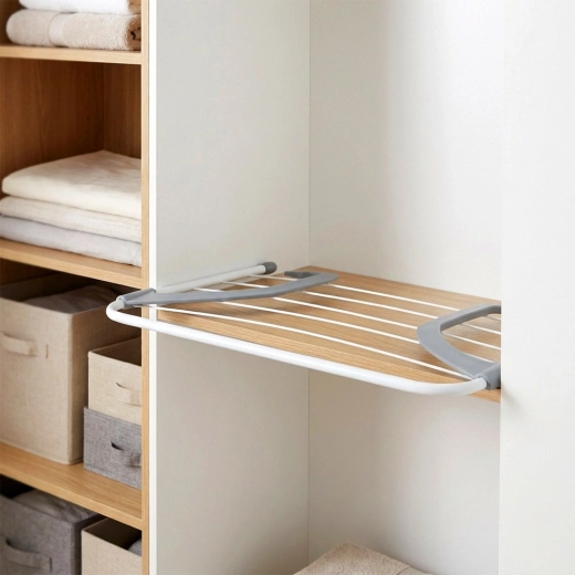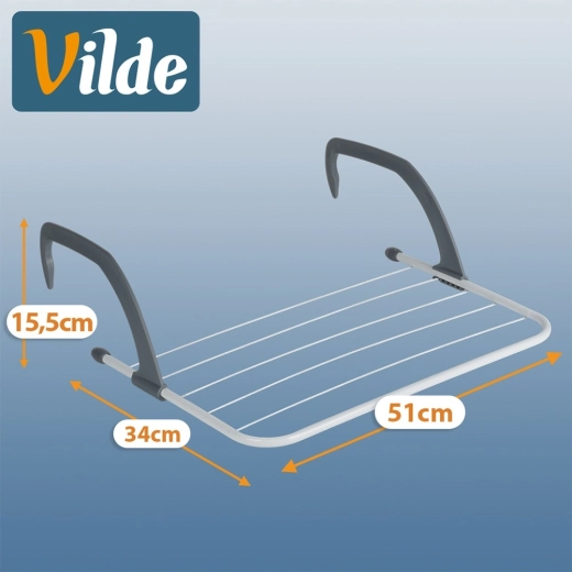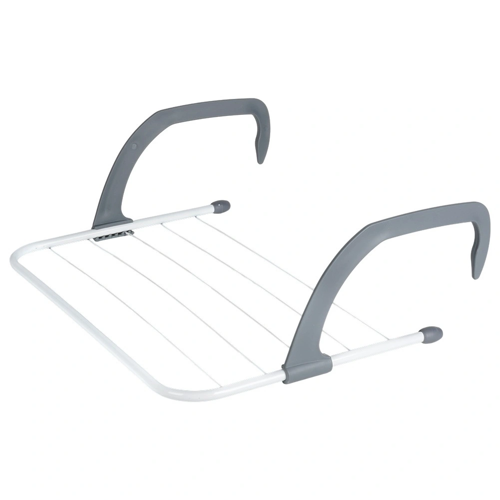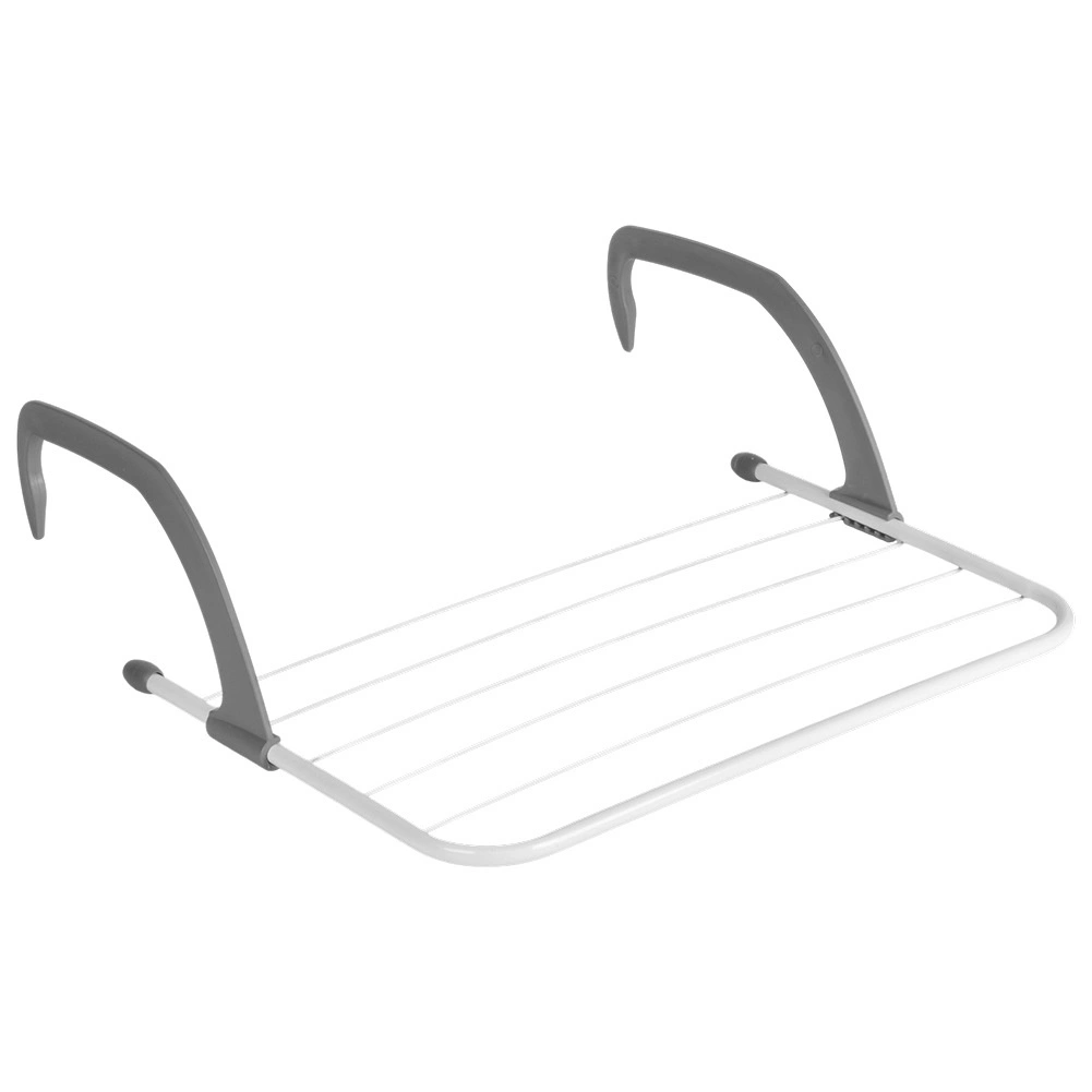 Kompaktowa zawieszana suszarka na grzejnik oszczędza miejsce i przyspiesza schnięcie prania dzięki ciepłu z ogrzewania. Ma wymiary 51 × 34 × 15,5 cm, jest wykonana z trwałego metalu w białym kolorze z szarymi hakami i oferuje 6 prętów o łącznej powierzchni suszenia 282 cm oraz udźwigu do 6 kg. Składane i regulowane ramiona umożliwiają zawieszenie na grzejniku, balustradzie lub balkonie bez wiercenia.