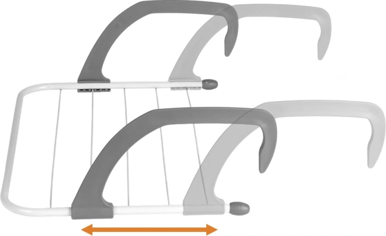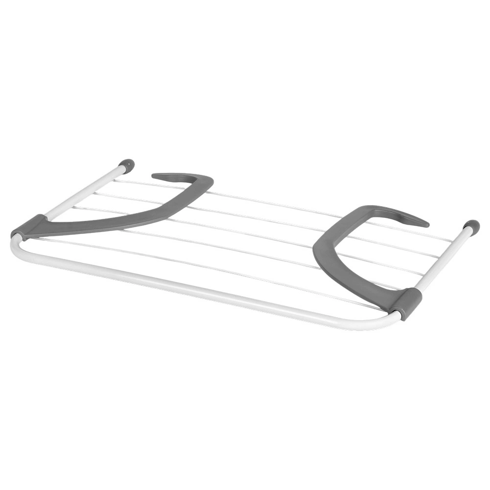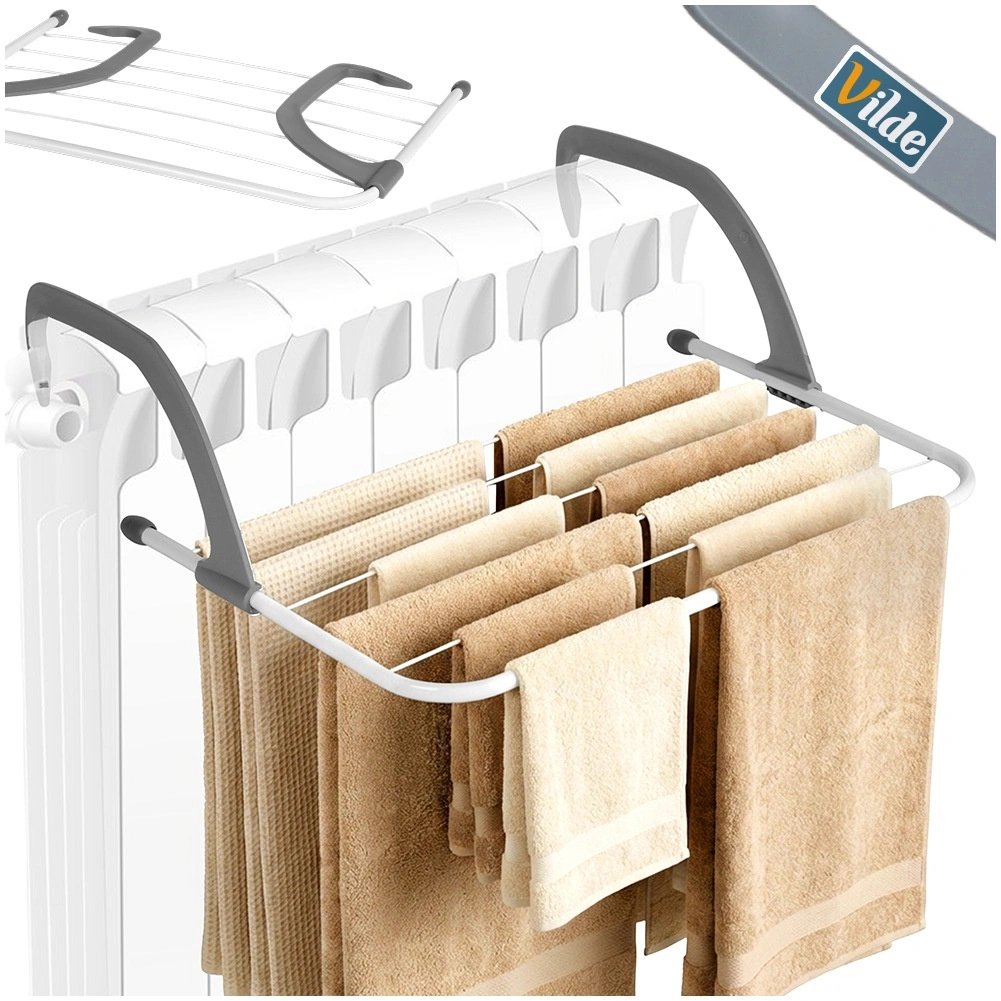 Szare ramiona można dopasować do szerokości grzejnika do ok. 13 cm, a po użyciu łatwo złożyć, co ułatwia kompaktowe przechowywanie.