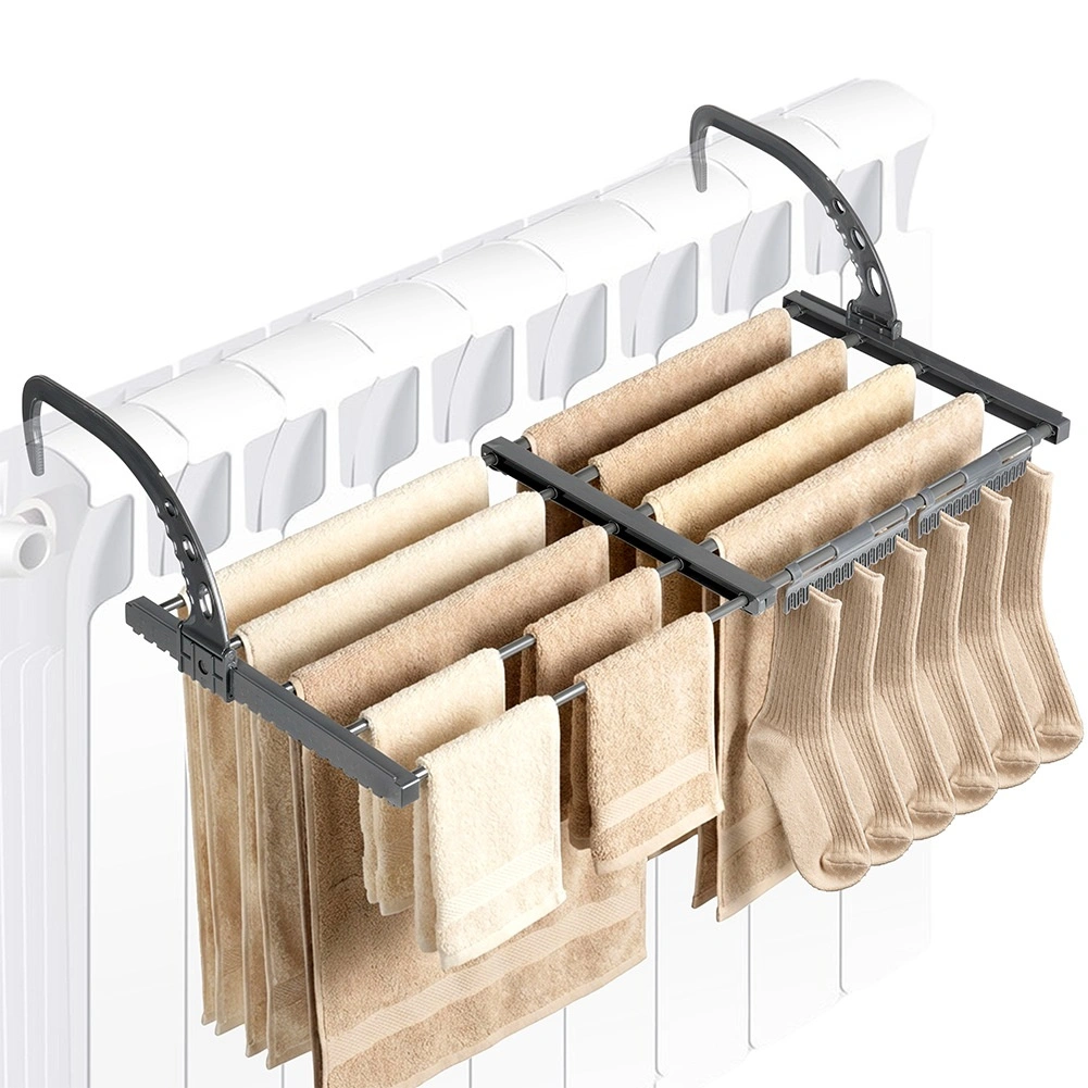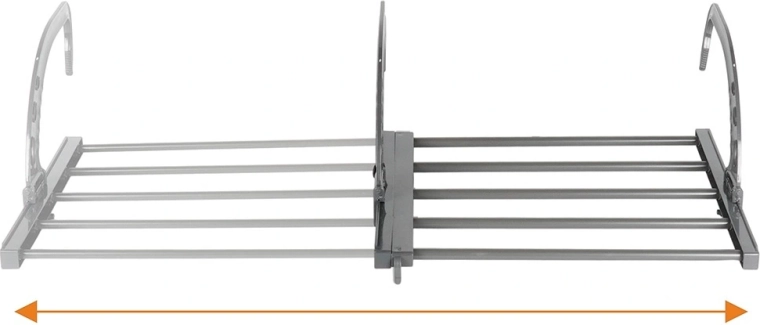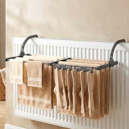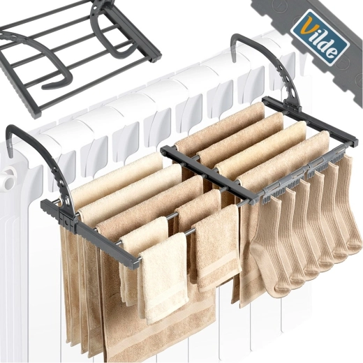 Praktyczna, rozsuwana suszarka na grzejnik oszczędza miejsce i przyspiesza schnięcie dzięki ciepłu z ogrzewania. Oferuje regulowaną szerokość 45–83 cm, solidną metalową konstrukcję oraz składane haki do łatwego montażu na różnych typach grzejników lub balustrad. Idealna do małych mieszkań, łazienek i na balkon.