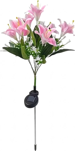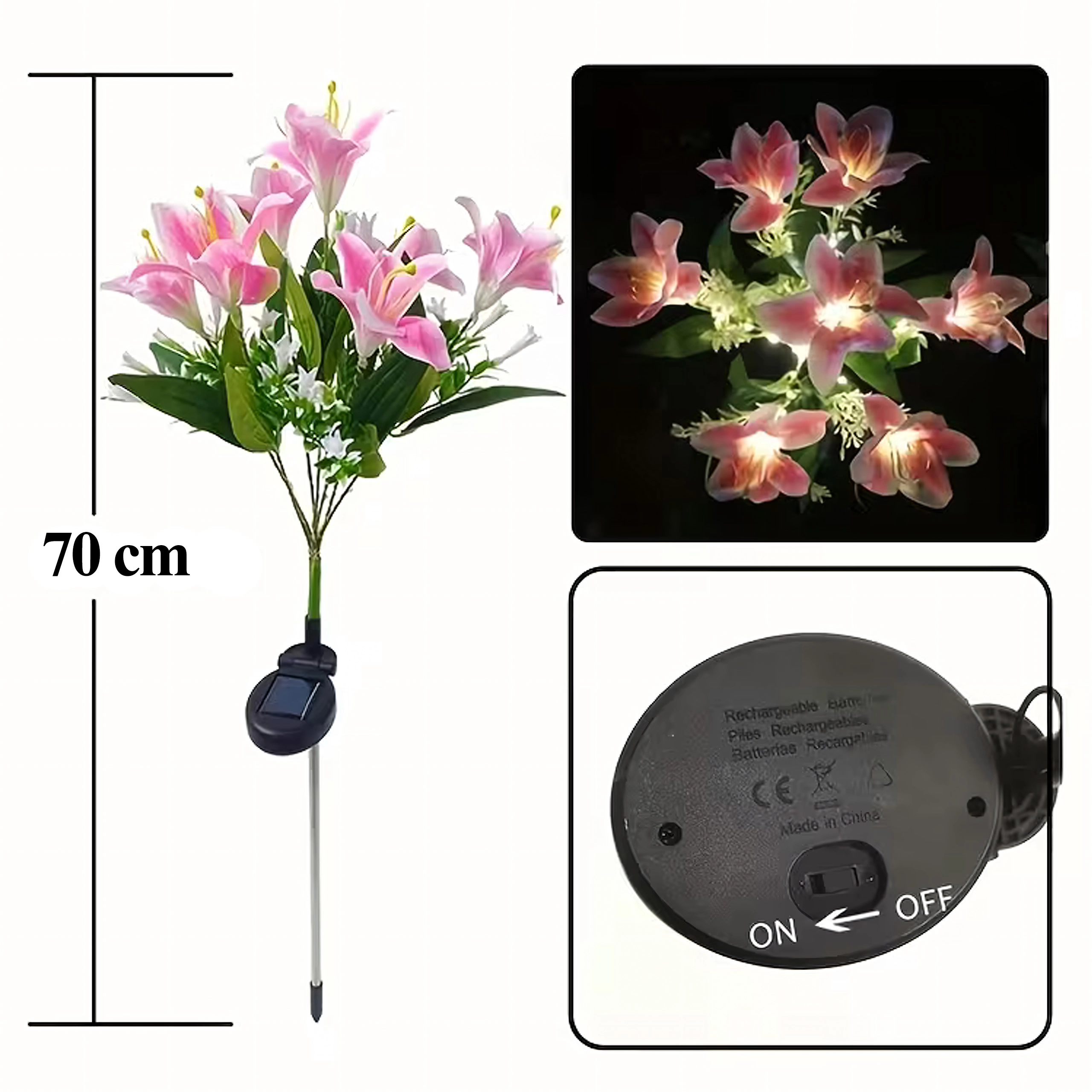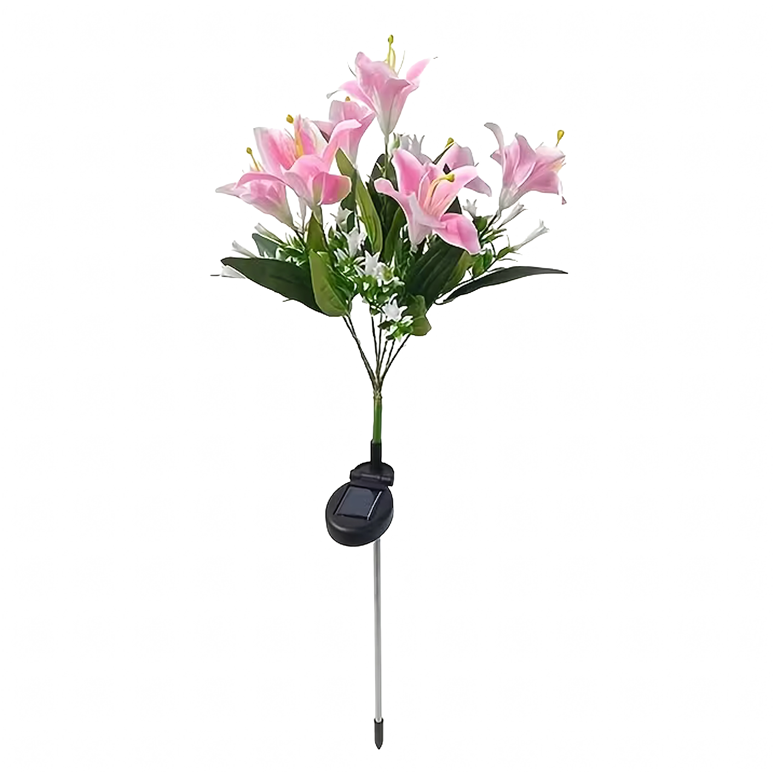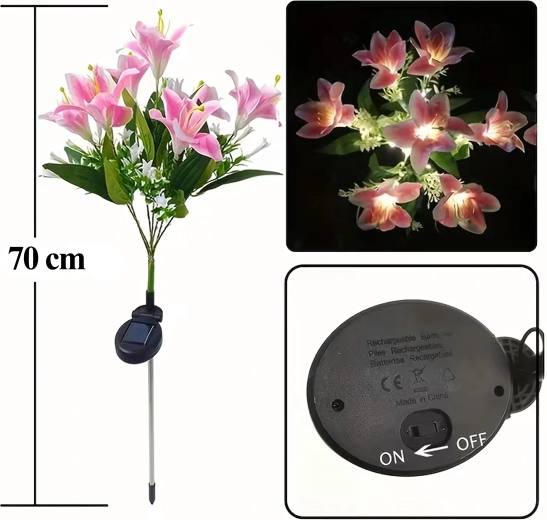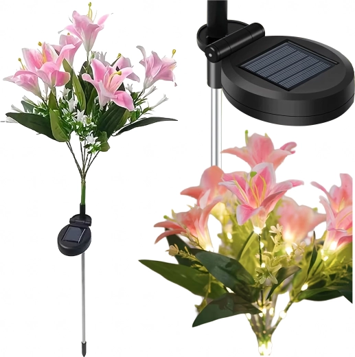 Rozjaśnij swoją rabatę lub ścieżkę stylową dekoracją – ta solarna ogrodowa lampa w kształcie lilii łączy realistyczne kwiaty, ciepłe białe LED oraz bezobsługowe zasilanie solarne. Łatwa instalacja poprzez wbicie w ziemię, w dzień się ładuje, a nocą automatycznie się włącza. Odporna na warunki pogodowe do całorocznego użytku na zewnątrz.