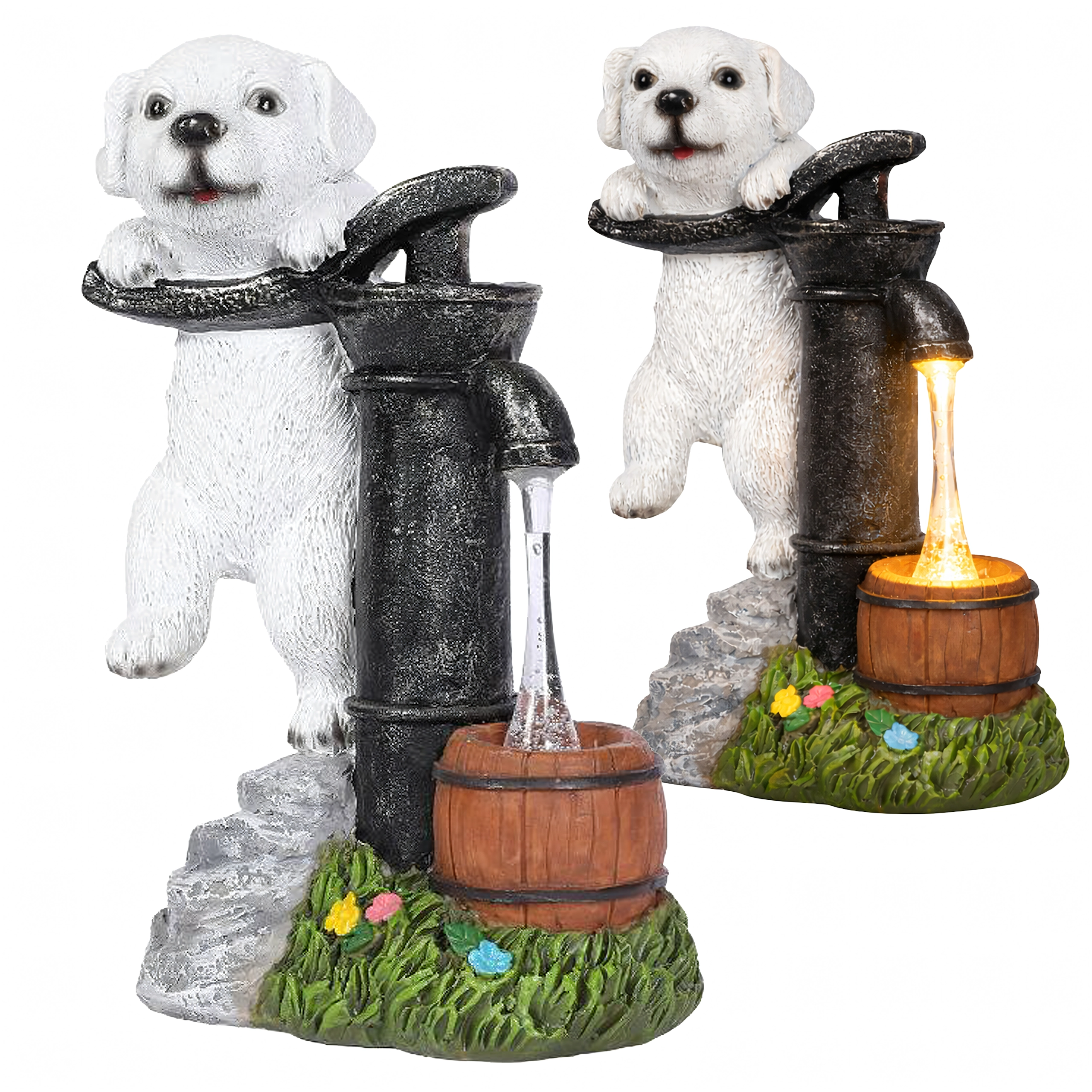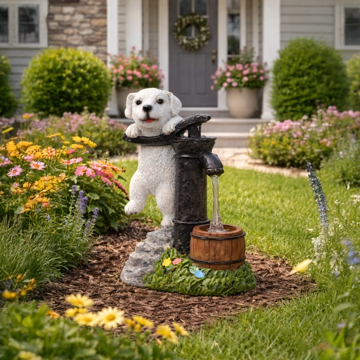 - Trwała dekoracja ogrodowa z realistycznymi detalami szczeniaka, pompy i beczki