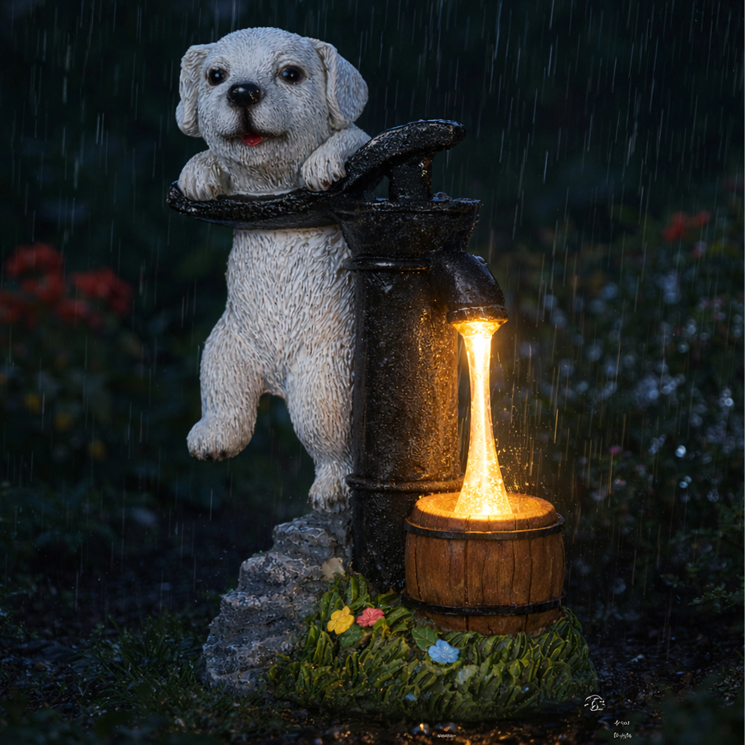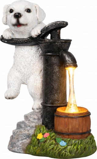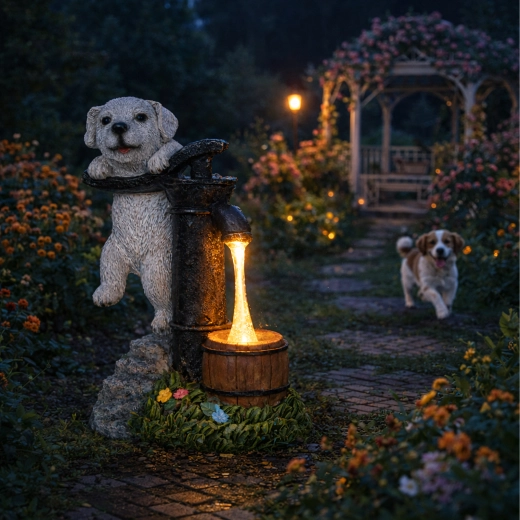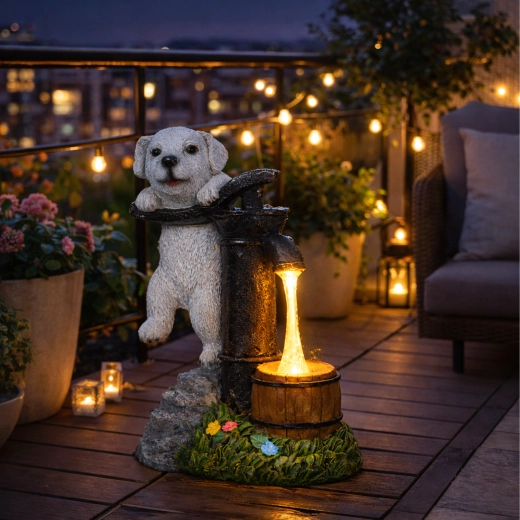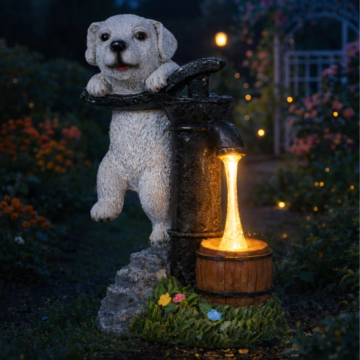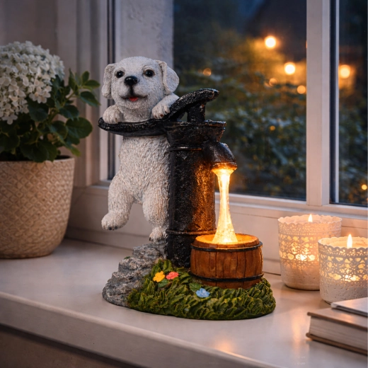 Stylowa dekoracja ogrodowa łączy urok szczeniaka opartego o vintage ręczną pompę z praktycznym oświetleniem LED. Ciepłe światło tworzy efekt strumienia wody do małej drewnianej beczki, dzięki czemu wieczorem Twój zewnętrzny kącik zyskuje przyjemne, ambientowe doświetlenie bez skomplikowanego montażu.