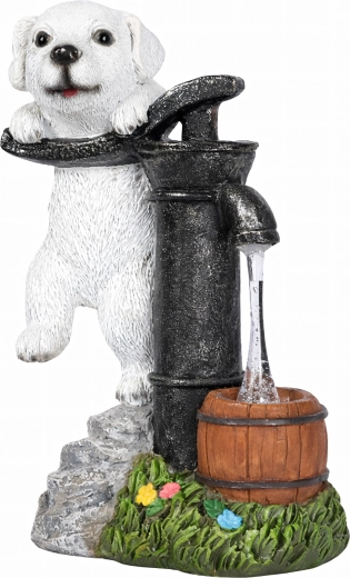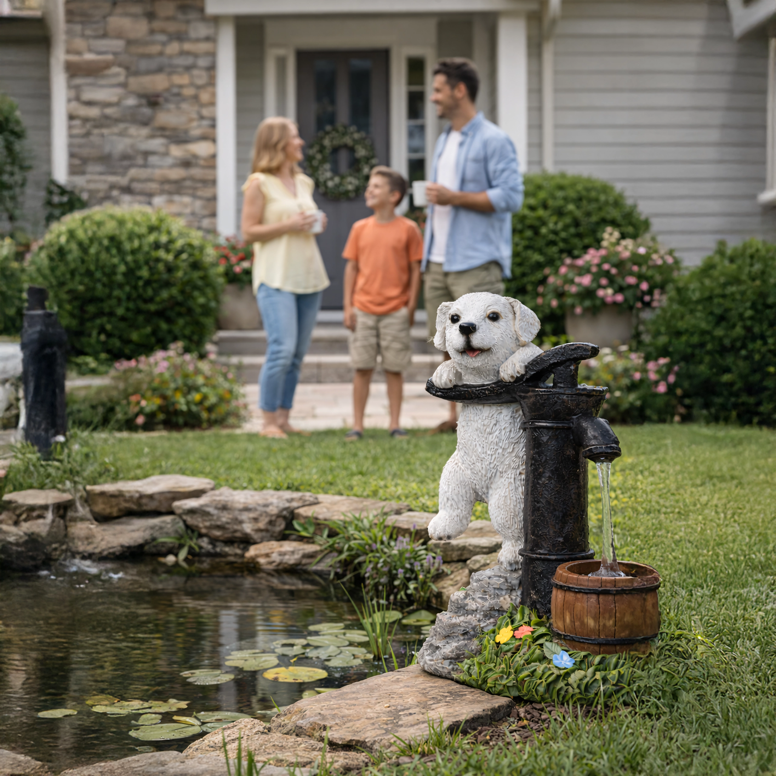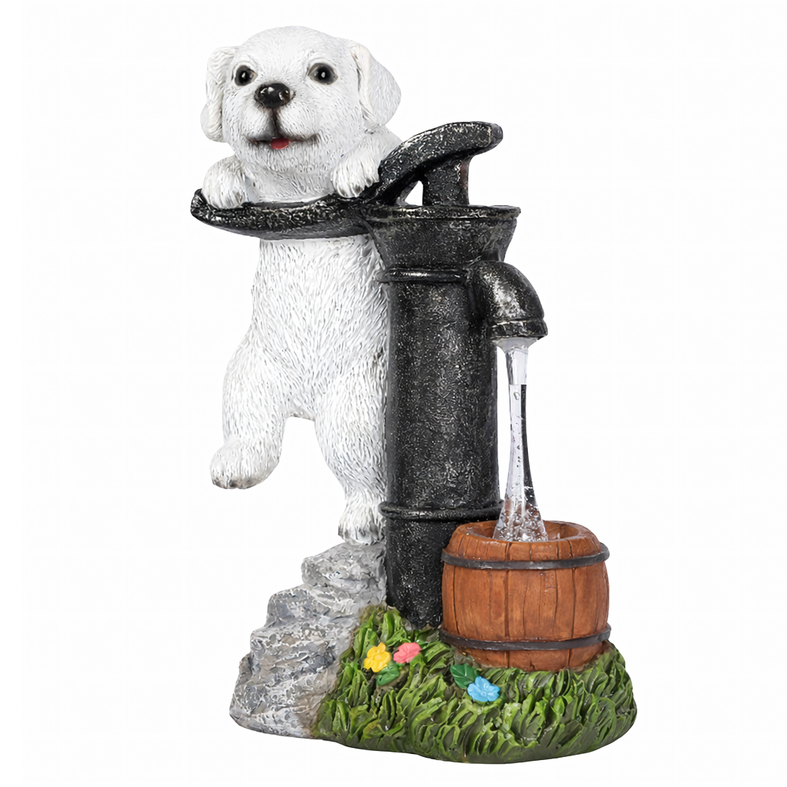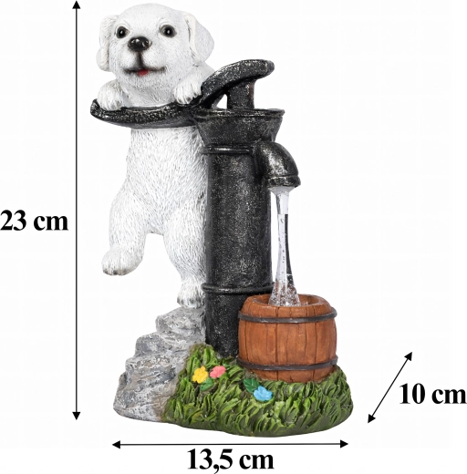 Realistyczna figurka szczeniaka przy starej pompie z drewnianą beczką, kamienną i trawiastą fakturą pasuje do ścieżek, rabat i na taras.