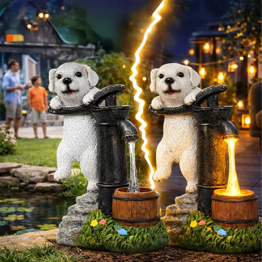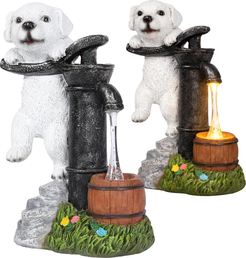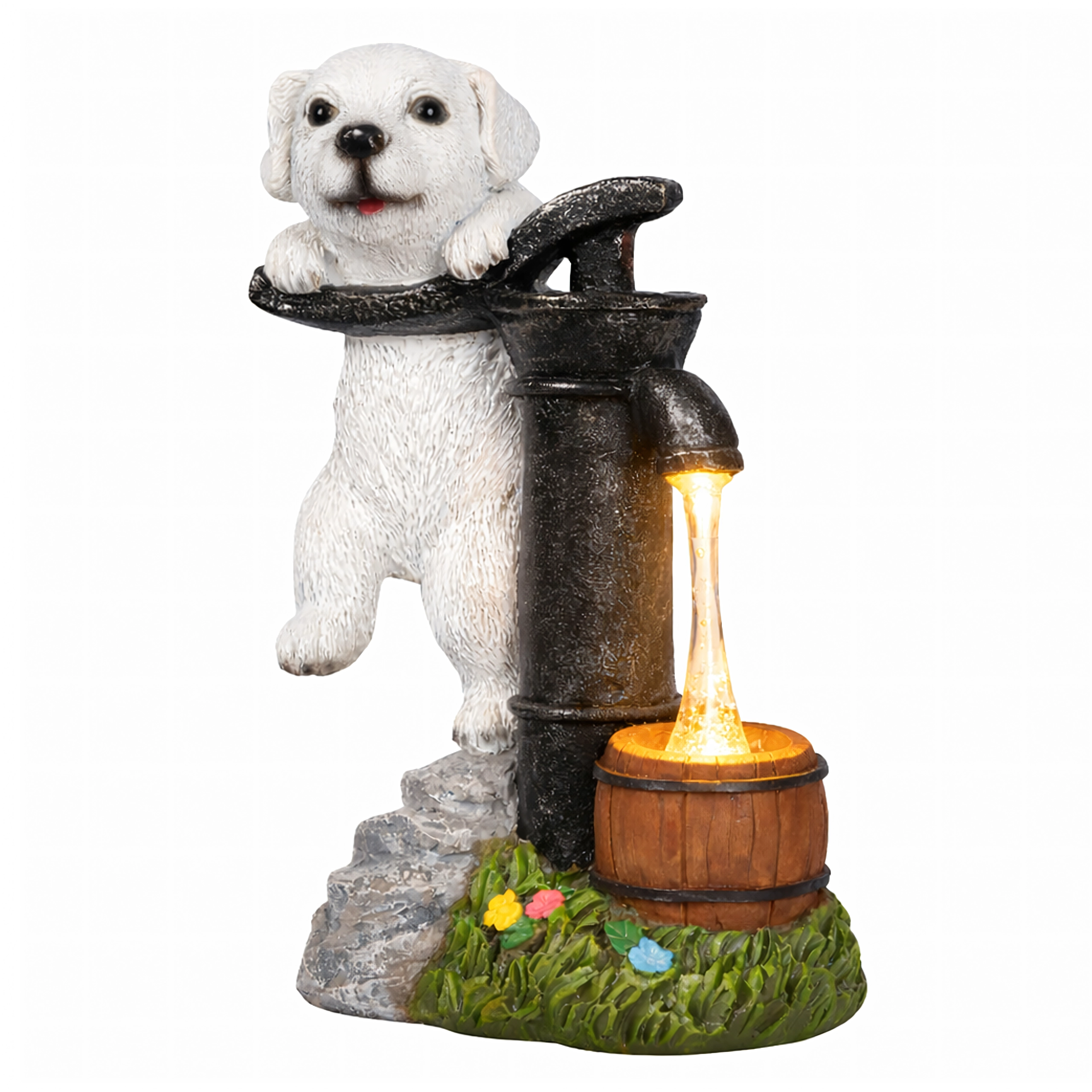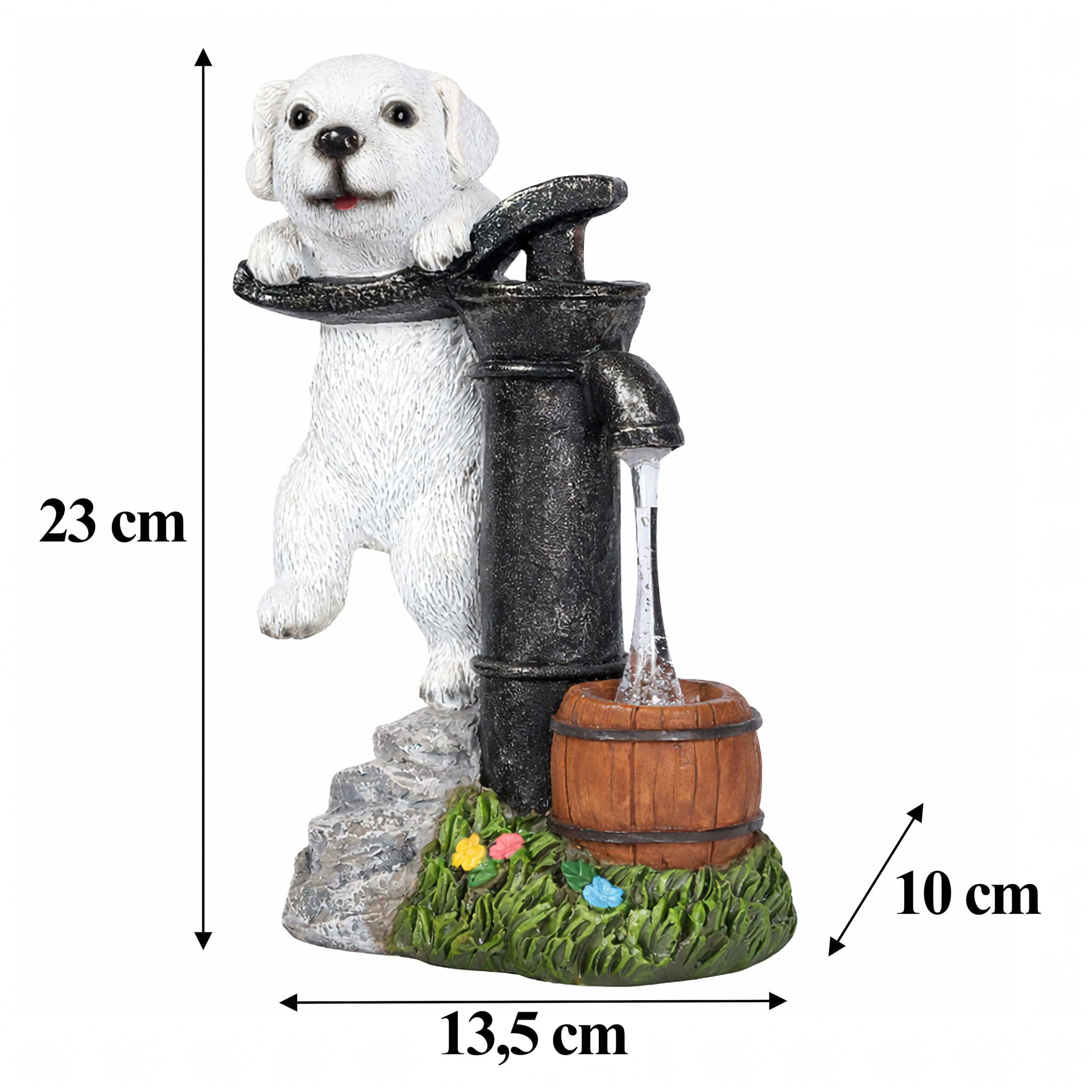 Urocza solarna lampa ogrodowa z figurką szczeniaka przy retro pompie doda Twojemu ogrodowi magicznej atmosfery. Dzięki wbudowanej ciepłej diodzie LED wieczorem rozświetli się, imitując płynącą wodę do drewnianej beczki. Idealna jako zewnętrzna dekoracja przy ścieżce, na tarasie lub przy rabatach – bez kabli, z zasilaniem solarnym i trwałym wykonaniem.