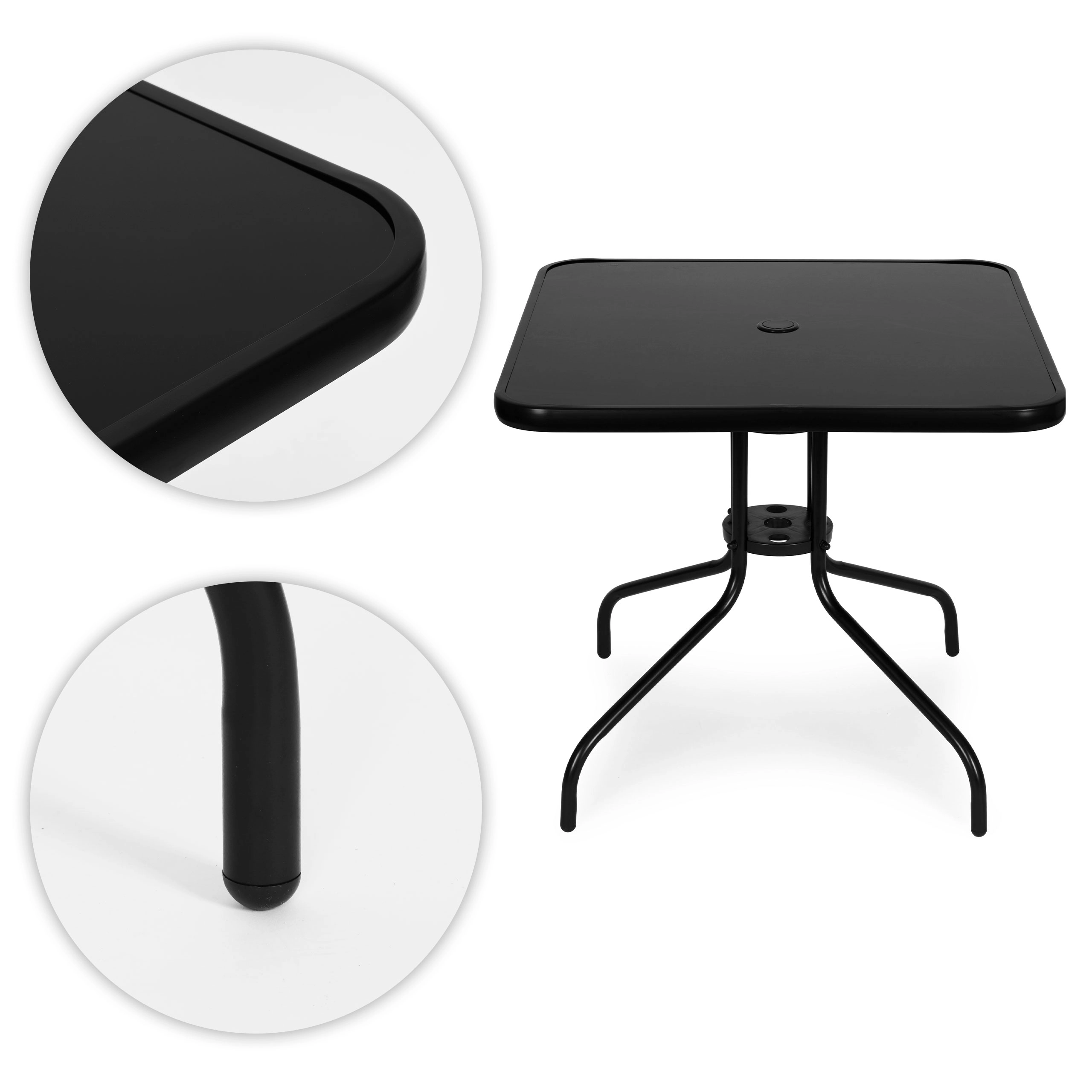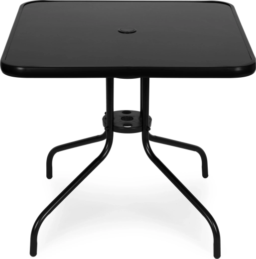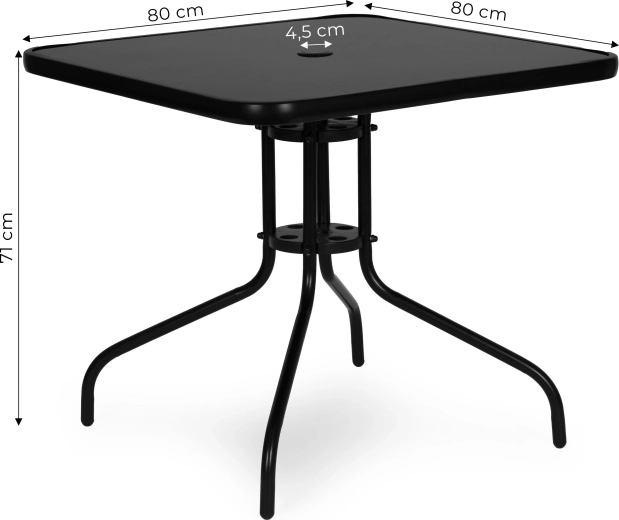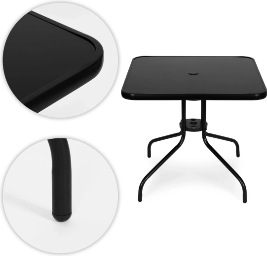 Stół zaprojektowano z myślą o wygodzie i praktyczności: centralny otwór na parasol (4,5 cm) pozwala stworzyć przyjemny cień w upalne dni, a gdy nie jest potrzebny, otwór zasłonisz dołączoną zaślepką. Powierzchnie łatwo się czyszczą, a stal malowana proszkowo niezawodnie opiera się wilgoci i korozji.