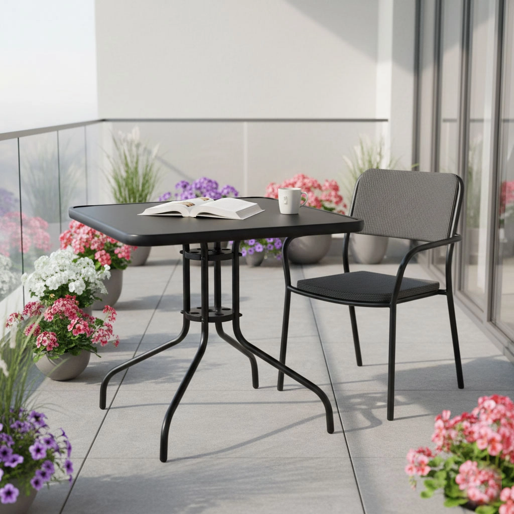 Wytrzymały blat z hartowanego szkła lepiej znosi uderzenia i wpływ pogody, łatwo się czyści, a elegancka czarna ramka chroni krawędzie i dodaje nowoczesnego wyglądu.