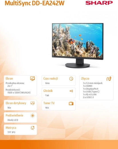 Stylowy 24,1" monitor NEC MultiSync EA242W w eleganckim czarnym kolorze jest idealny do biura i pracy w domu. Oferuje zrównoważony obraz, oszczędną pracę i niezawodną jakość wykonania. Dzięki szerokim kątom widzenia i wysokiej rozdzielczości zapewnia komfortowe wyświetlanie dokumentów, stron internetowych i multimediów. Ergonomiczna podstawa, niskie zużycie energii oraz wysoka niezawodność czynią z tego modelu świetny wybór do codziennego użytkowania.