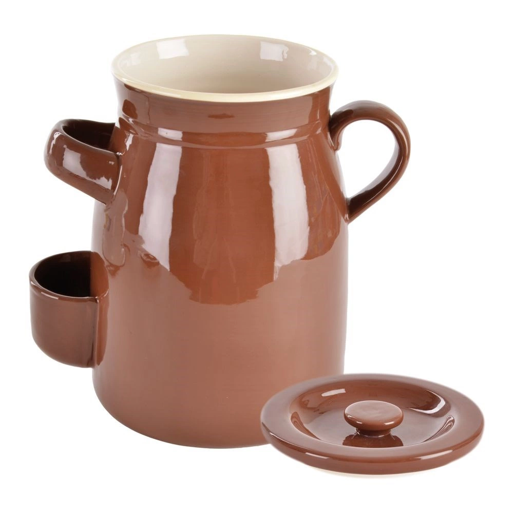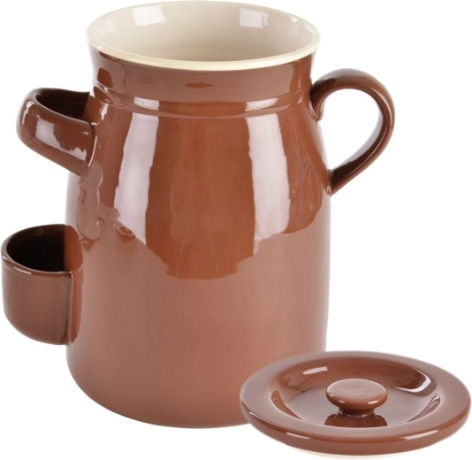 Kompaktowy ceramiczny garnek fermentacyjny o pojemności 2,5 l z hermetyczną pokrywką, praktycznymi uchwytami i drewnianymi szczypcami do łatwego wyjmowania przysmaków. Szkliwiona ceramika w brązowym kolorze utrzymuje stałą temperaturę i chroni zawartość przed światłem, co wspiera prawidłową fermentację warzyw, serów czy ryb w zalewie, soli lub occie.
