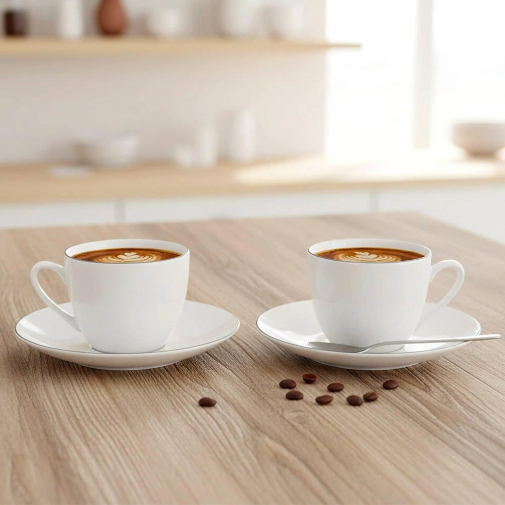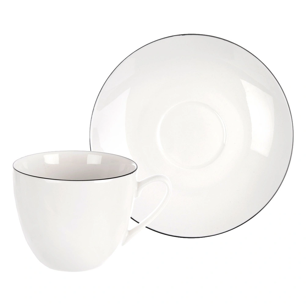 Biała porcelana z cienką ciemną obwódką pasuje do nowoczesnych i klasycznych wnętrz oraz podkreśla serwowanie kawy i herbaty.