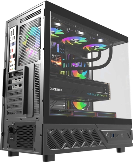 Chłodzenie bez kompromisów. Gęste siatki wentylacyjne oraz możliwość instalacji aż 9 wentylatorów lub górnego radiatora 240/280/360 mm utrzymują temperatury w ryzach nawet pod obciążeniem. W zestawie znajduje się 6× wentylator 120 mm, więc masz świetny przepływ powietrza od razu po złożeniu. Magnetyczne filtry przeciwkurzowe i boczne panele z szybkim zwalnianiem ułatwiają konserwację oraz szybkie modernizacje bez użycia narzędzi.