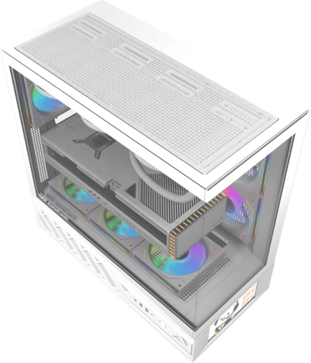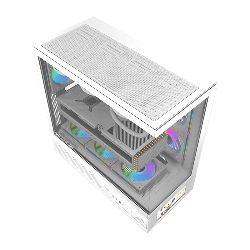 Dodaj swojemu komputerowi wyjątkowy charakter. Panoramiczna konstrukcja z kątem 270° i dwoma panelami z hartowanego szkła pozwala perfekcyjnie wyeksponować podzespoły i efekty RGB, a zintegrowany 6" wyświetlacz IPS (480 × 960) pokaże temperatury CPU/GPU lub Twoje zdjęcia i filmy (JPG/PNG/MP4). Przestronna obudowa pomieści wydajny zestaw do gier lub pracy bez kompromisów.