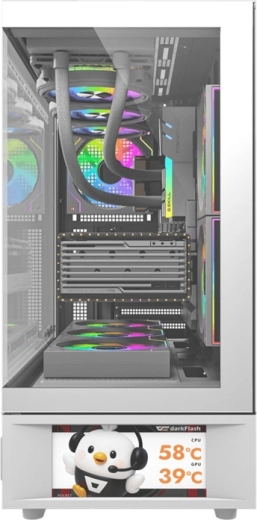 Stylowa obudowa komputerowa DarkFlash w kolorze białym z panoramicznym designem i wbudowanym 6" wyświetlaczem IPS do informacji systemowych lub własnych treści. Oferuje dwie panele z hartowanego szkła, miejsce na GPU do 400 mm i chłodzenie CPU 180 mm, świetny przepływ powietrza z maks. 9 wentylatorami oraz wsparcie dla chłodzenia wodnego 240/280/360 mm. W zestawie znajduje się 6 fabrycznie zainstalowanych wentylatorów 120 mm oraz nowoczesny panel I/O z USB‑C 3.2 Gen 2.