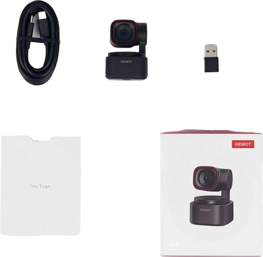 Kamera internetowa OBSBOT Tiny 3 Lite; kabel USB‑C – USB‑C; adapter USB‑C – USB‑A
