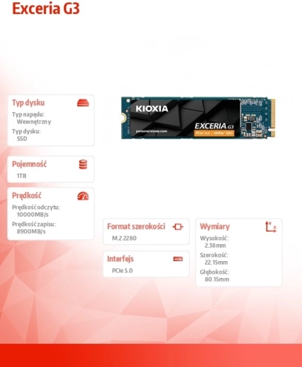 Zwiększ szybkość swojego komputera dzięki dyskowi SSD KIOXIA Exceria G3 o pojemności 1 TB w formacie M.2 2280. Nowoczesny interfejs PCIe 5.0 zapewnia błyskawiczne prędkości sekwencyjne do 10 000 MB/s odczytu i 8 900 MB/s zapisu, co oznacza szybkie uruchamianie systemu, ekspresowe wczytywanie gier i płynną pracę w wymagających aplikacjach. Dzięki pamięci 3D BiCS FLASH zyskujesz niezawodną wydajność i efektywną pracę zarówno w komputerach stacjonarnych, jak i laptopach.