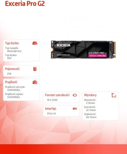 Potrzebujesz więcej szybkości do gier, montażu wideo i pracy 3D? KIOXIA Exceria Pro G2 należy do najszybszych konsumenckich dysków SSD marki KIOXIA i wykorzystuje nowoczesny interfejs PCI Express 5.0 dla topowej wydajności oraz niskich opóźnień. Idealny wybór do wydajnych zestawów gamingowych i kreatywnych stacji roboczych.