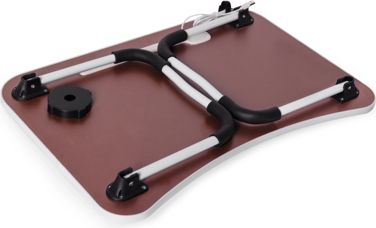 Praktyczny przenośny stolik na laptopa marki ModernHome o wymiarach 60 × 40 cm zapewnia ergonomiczną wysokość do pracy na kanapie i w łóżku, wbudowany port USB do zasilania lampki LED i mini wentylatora, miejsce na telefon/tablet oraz uchwyt na napój. Stabilne aluminiowe nogi z antypoślizgowymi końcówkami i wytrzymały blat łatwo się czyści.