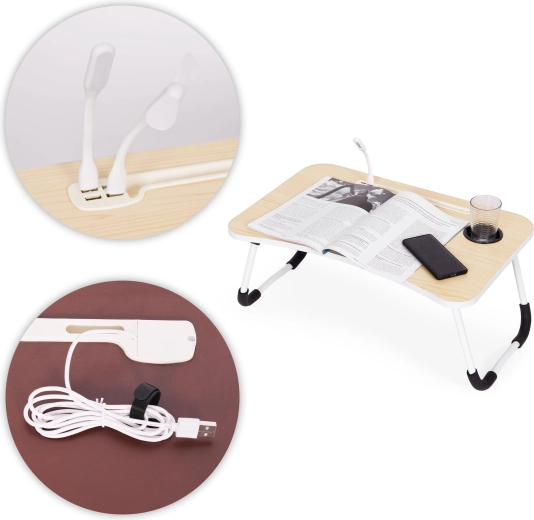Wytrzymała płyta wiórowa z ochronną powłoką jest odporna na plamy i zarysowania oraz łatwa w utrzymaniu. Składane nogi z aluminium gwarantują stabilność, a antypoślizgowe końcówki pewny kontakt z podłożem. W zestawie przewód USB ok. 145 cm do zasilania wbudowanego portu USB.